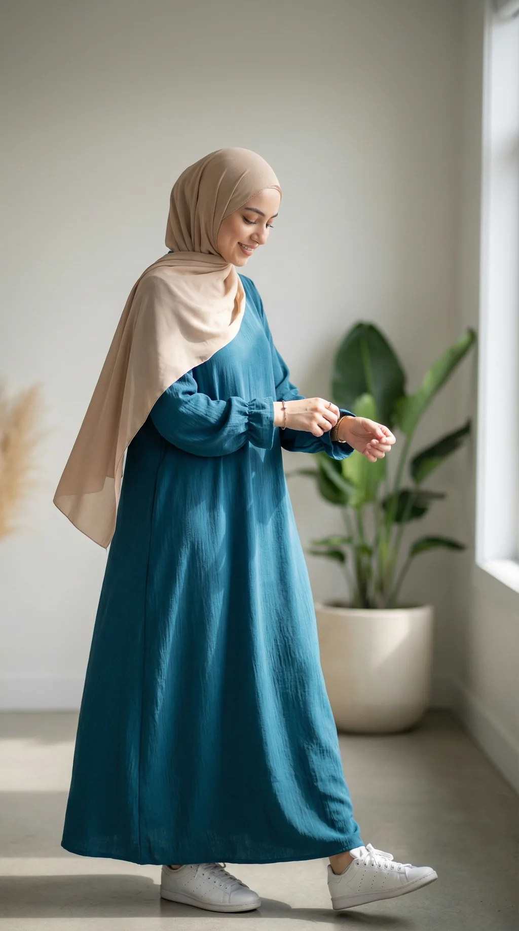 Confectionnée en matière Jazz, elle est agréable à porter et offre un rendu légèrement texturé, idéal pour un look soigné. À associer avec un hijab beige, écru ou noir pour un ensemble harmonieux.