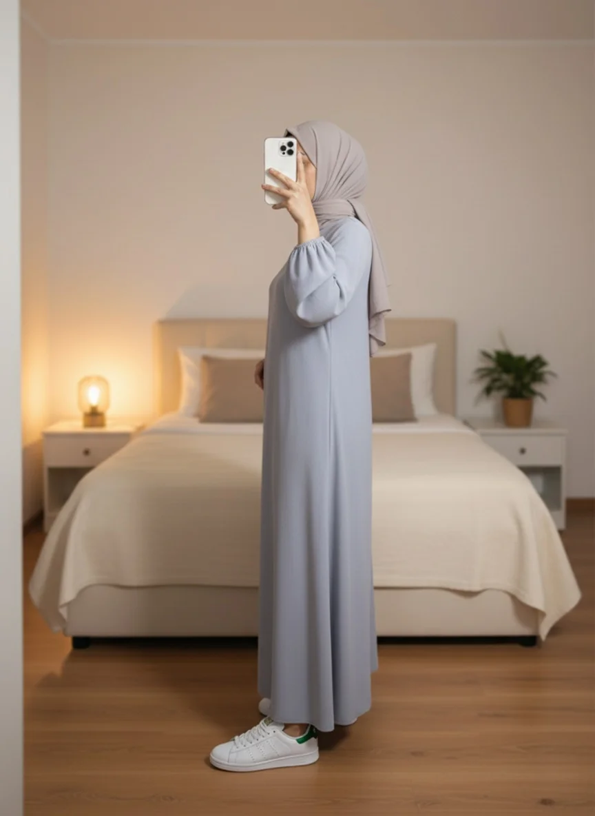 Abaya Grise Simple Longue et Ample avec Manches Élastiques - Lifestyle Photo - Model Style: Hijabi