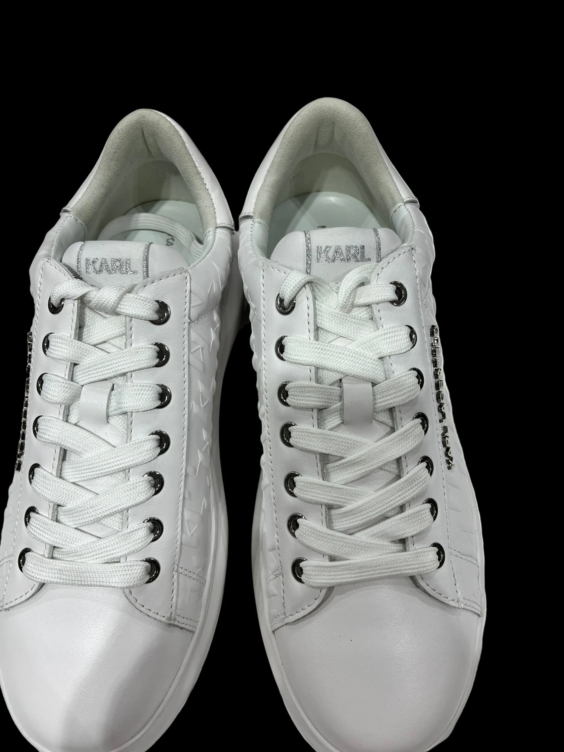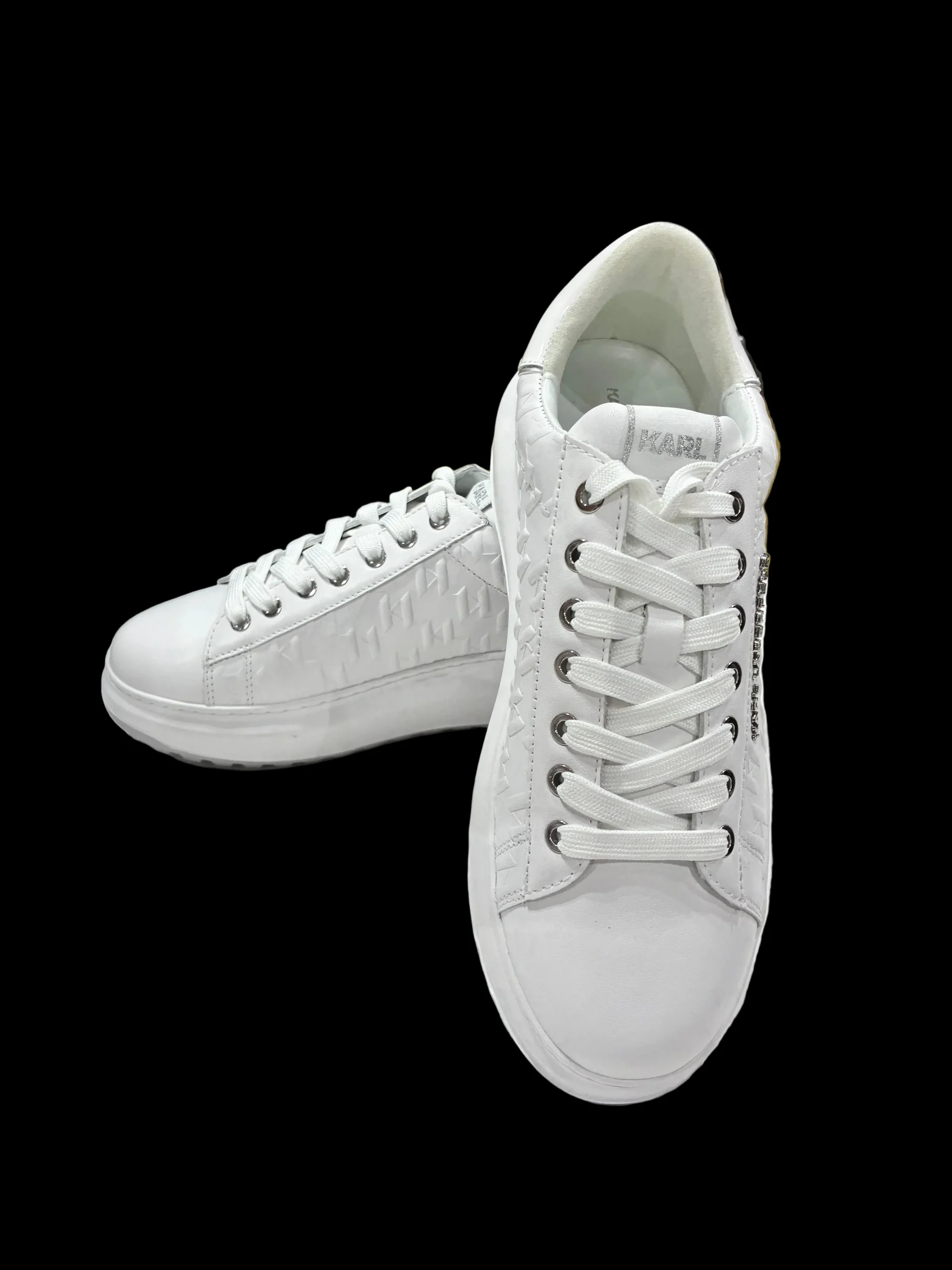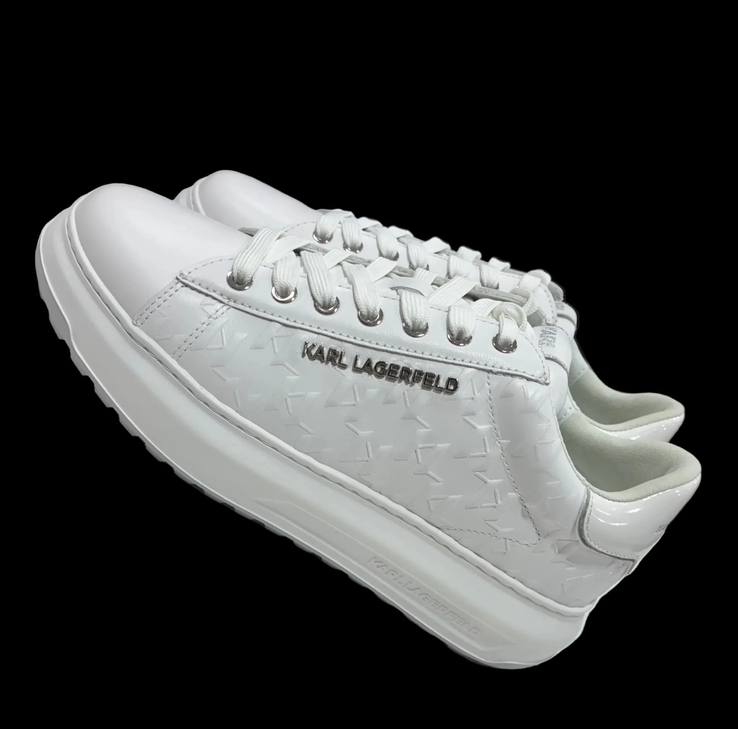 Description détaillée : Couleur : blanc intégral, avec de légères nuances blanc/gris très claires. Matière : cuir lisse de qualité, avec des motifs géométriques embossés sur les côtés qui apportent du relief sans être voyants ( KL PRINT) Lacets : blancs, plats, passés dans des œillets métalliques argentés. Logo : KARL LAGERFELD visible sur le […]