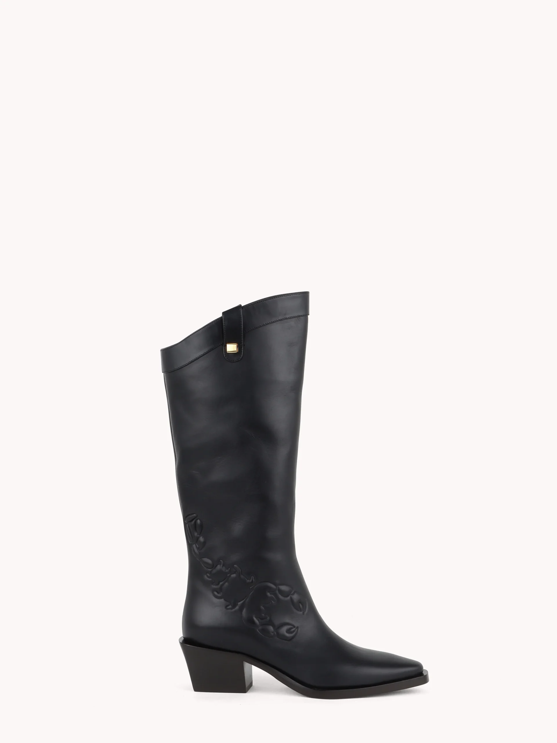 L’incontournable botte Santiag est revisitée par la Maison Skorpios à travers une botte iconique aux lignes graphiques et épurées. Le scorpion, symbole fort de la marque, se retrouve en flocage sur du cuir lisse.