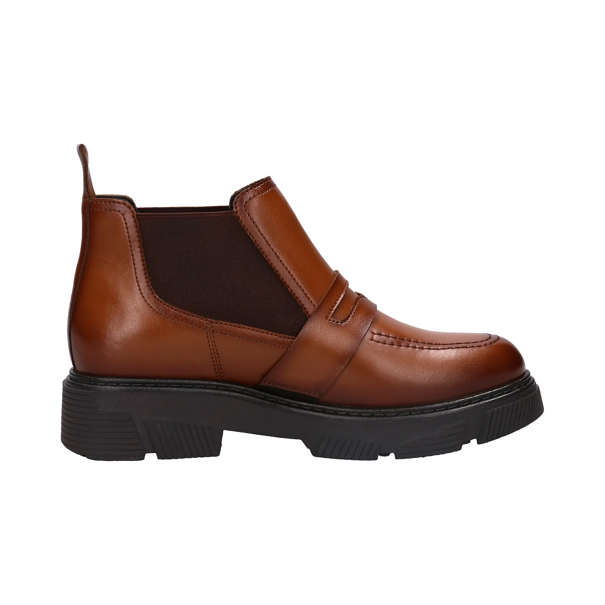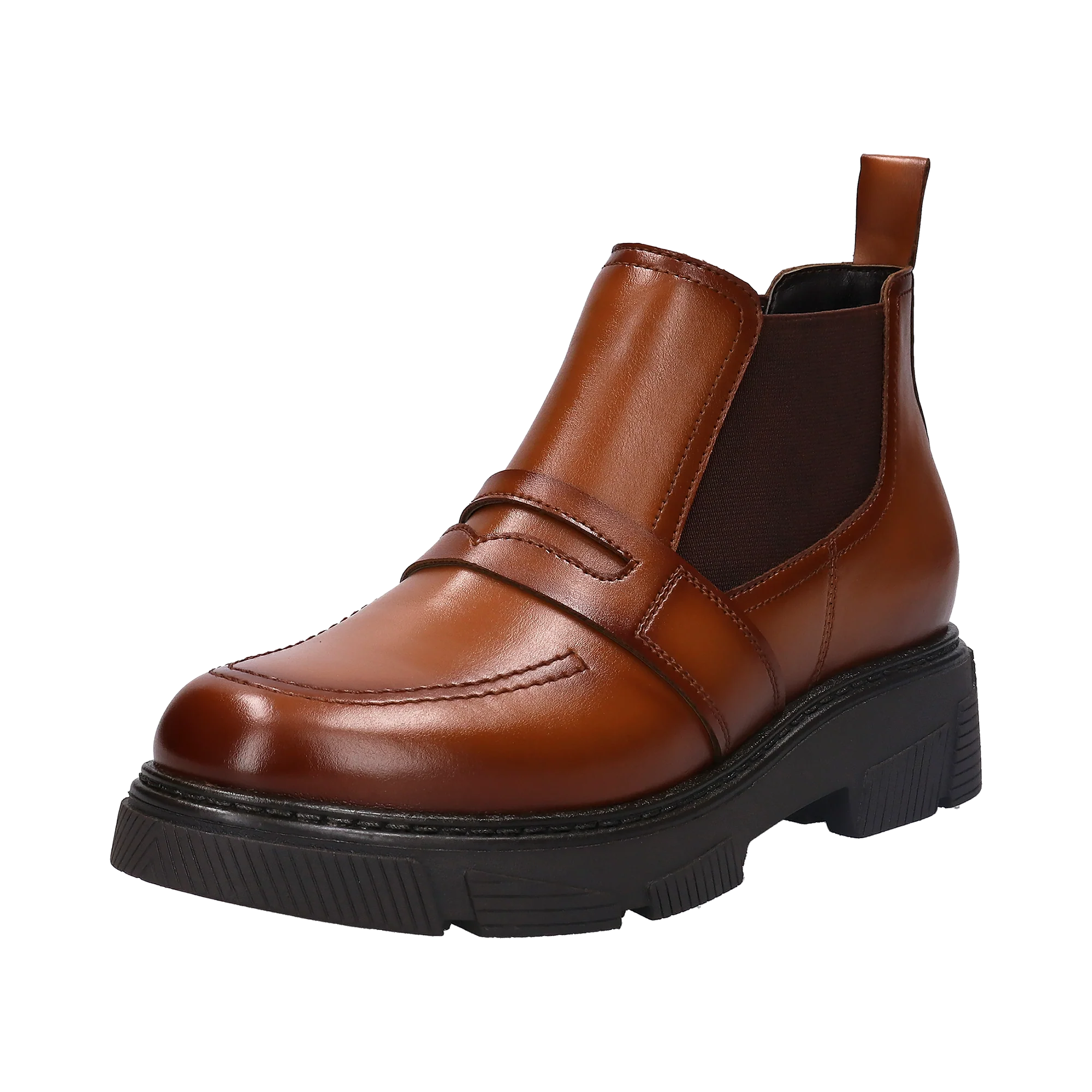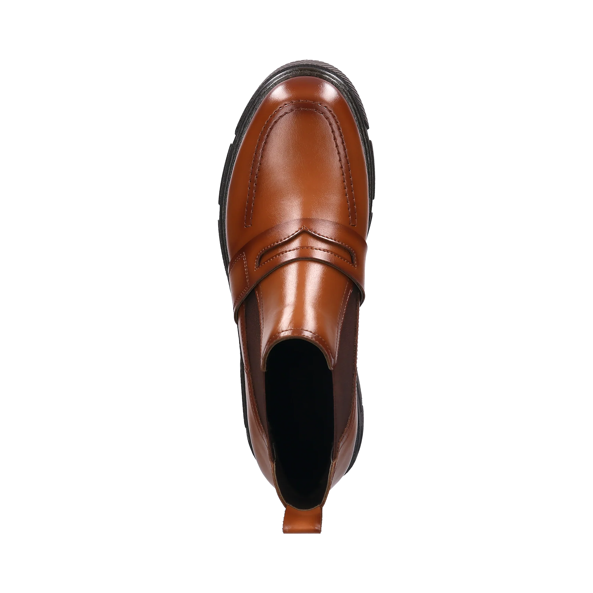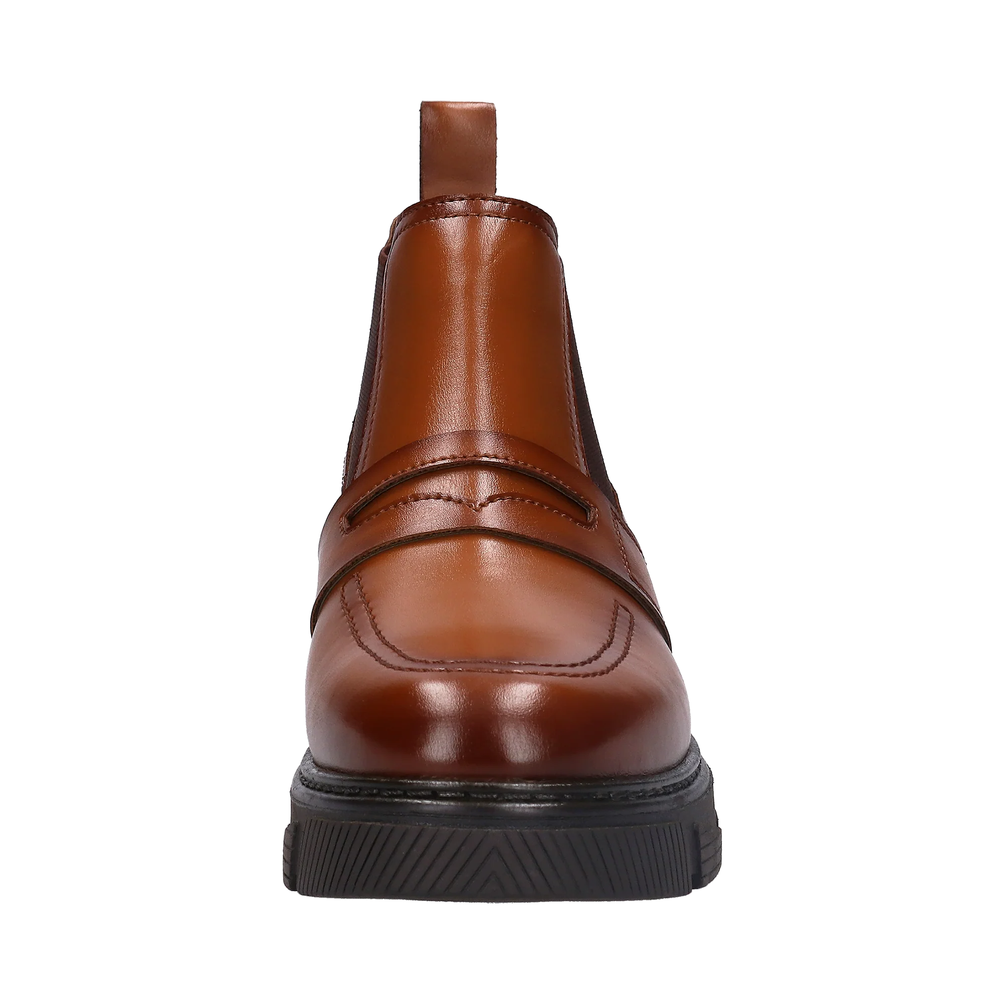 Diese Lederstiefel im Chelsea-Stil in sattem Cognac vereinen zeitlosen Stil mit modernem Flair. Sie verfügen über eine praktische Zuglasche für einen einfachen und bequemen Einstieg. Die Stiefel zeichnen sich durch ein minimalistisches Design aus. Die Nähte sind sauber und elegant. Sie sind aus hochwertigem Leder gefertigt und sorgen für Langlebigkeit und einen luxuriösen Look.