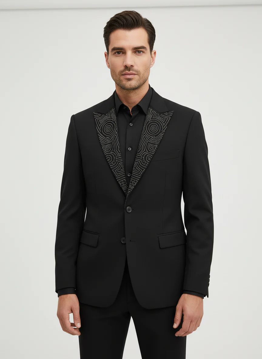 Coupe et style Veste ajustée (type smoking ou costume de cérémonie). Épaules structurées, donnant une silhouette nette et formelle. Deux boutons sur le devant. Poches à rabat de chaque coté et une poche poitrine classique. Élément distinctif : le col ? Le revers est la partie la plus remarquable : il est recouvert d?un motif […]