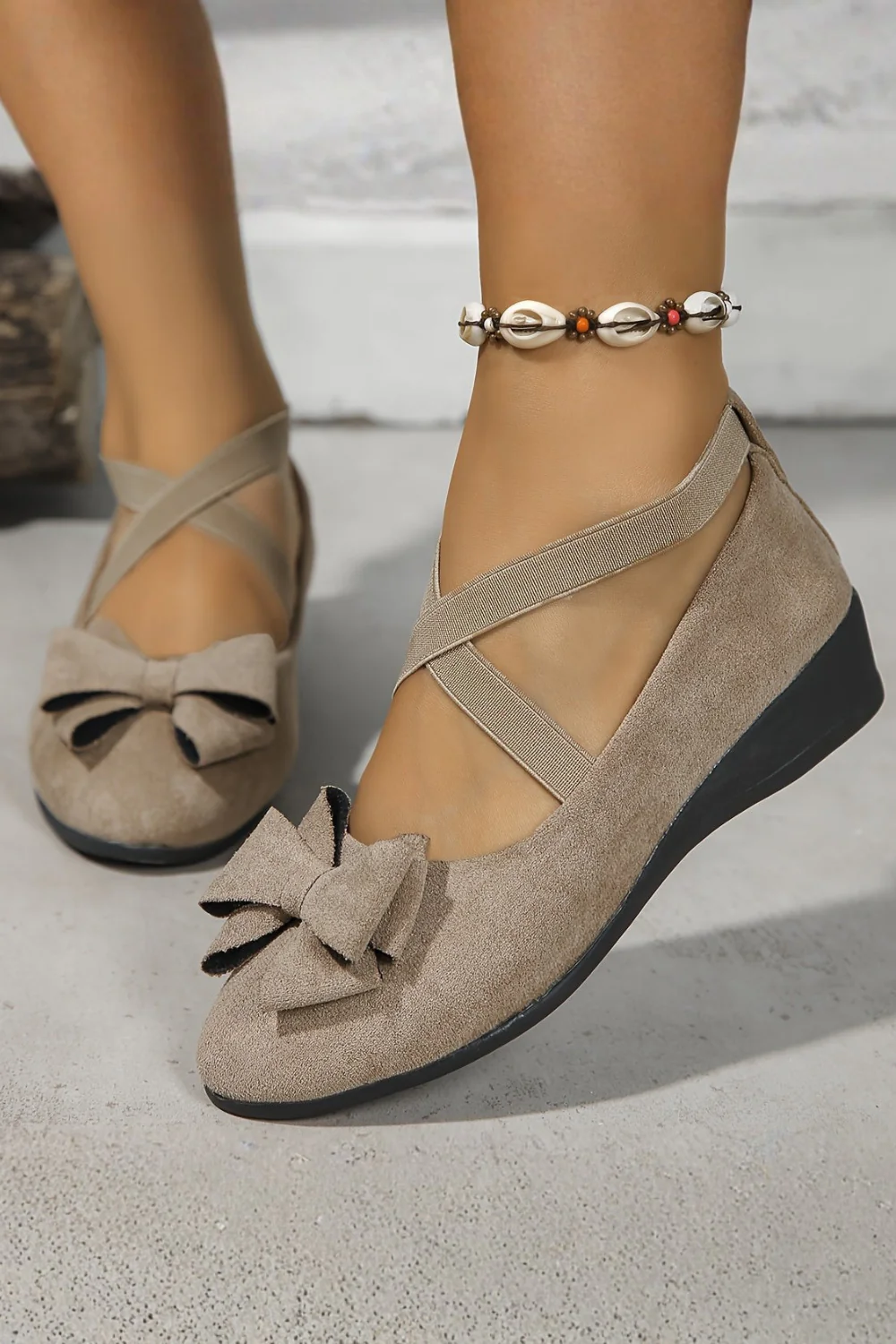 - Semelle compensée offrant stabilité et soutien.