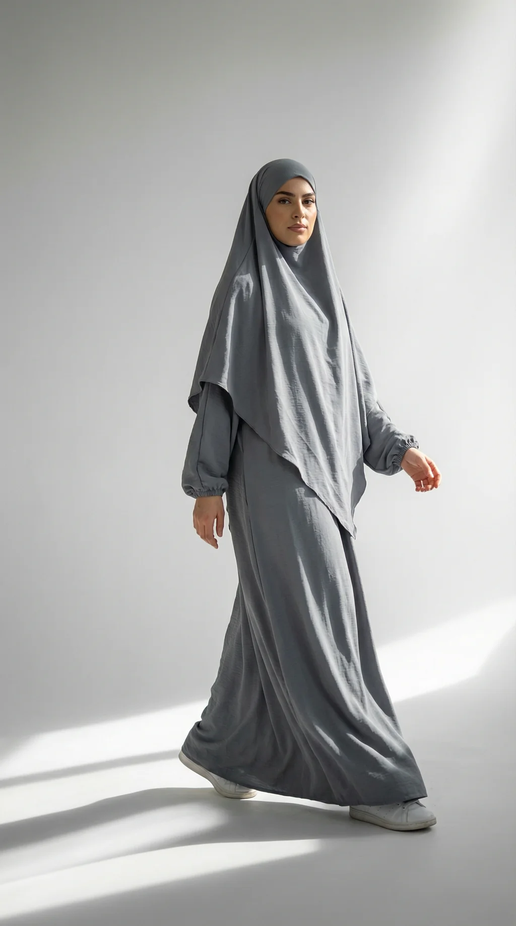 Ce jilbeb gris anthracite est l’alternative parfaite au noir : une teinte profonde, sobre et très facile à assortir. Sa coupe ample assure un tombé naturel et une liberté de mouvement idéale, pour la prière, les sorties ou le quotidien.