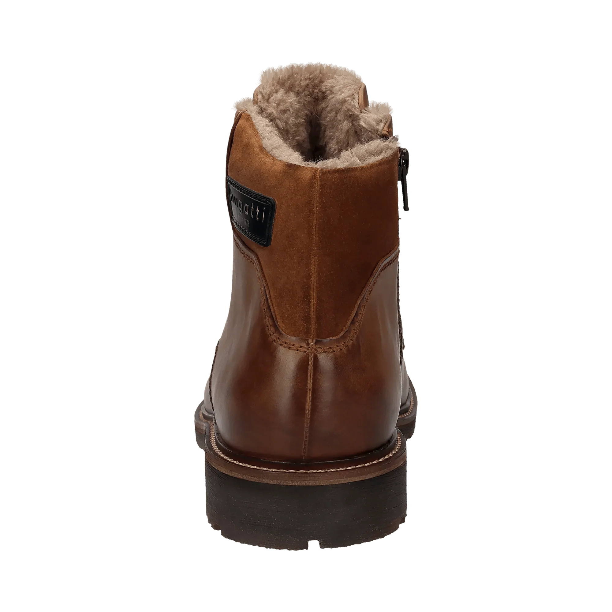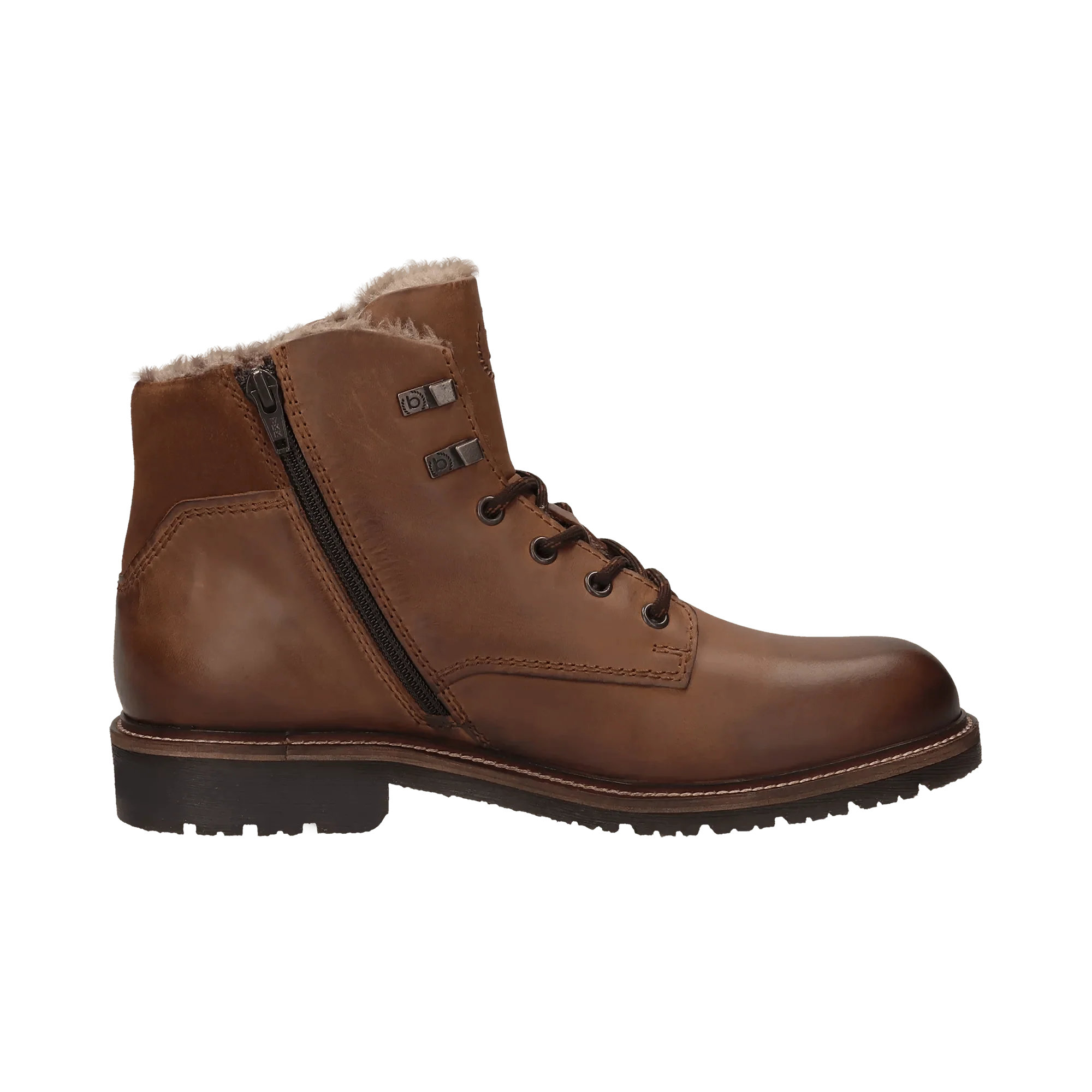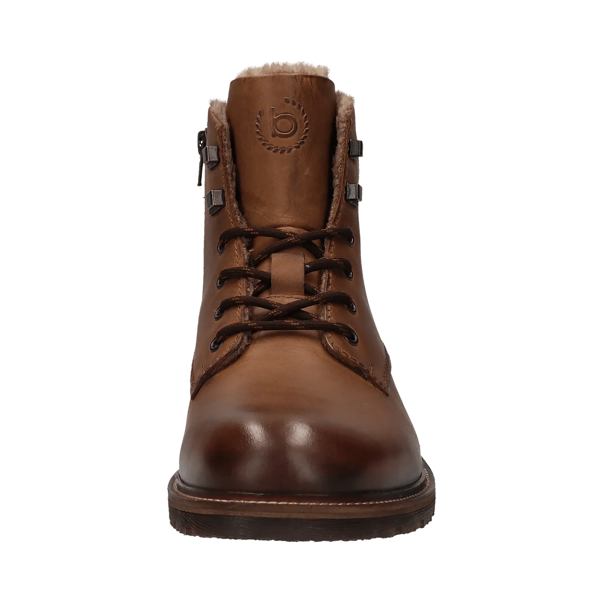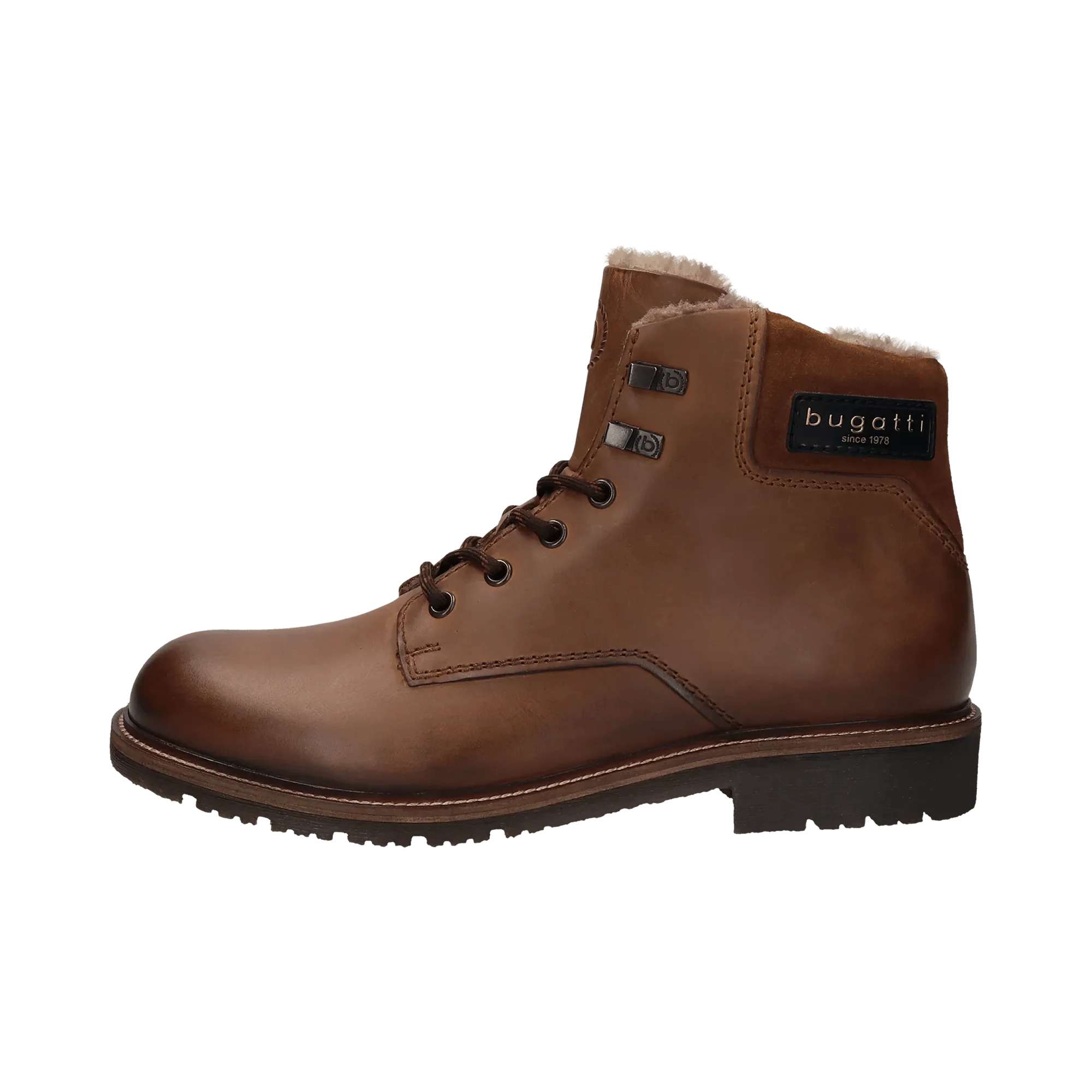Unsere cognacbraunen, mit Kunstfell gepolsterten Stiefel zeichnen sich durch ein einfaches Profil aus und sind ideal für den Winter, da sie Schutz vor Kälte bieten. Diese Herrenstiefel mit herausnehmbarer Innensohle sind aus hochwertigem, knitterfreiem Leder gefertigt. Sie sind mit einem Logo versehen und passen zu verschiedensten Freizeitlooks.