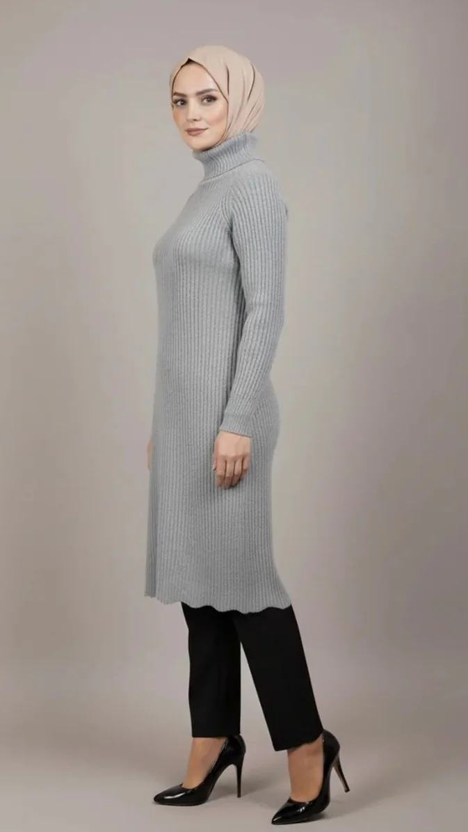 Pull Long Col Roulé en Maille Côtelée gris pour Femme Musulmane – Élégance et Modestie