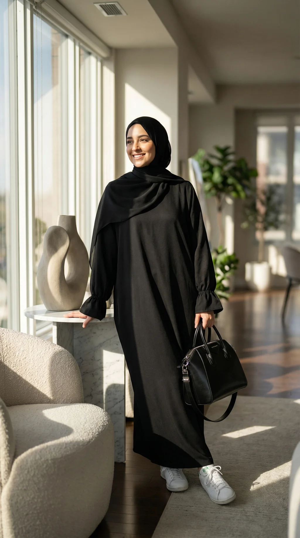 Confectionnée en matière Jazz, elle offre un tombé naturel et un rendu légèrement texturé. À associer avec un hijab noir pour un total look, ou avec un hijab beige, taupe ou écru pour un contraste chic.