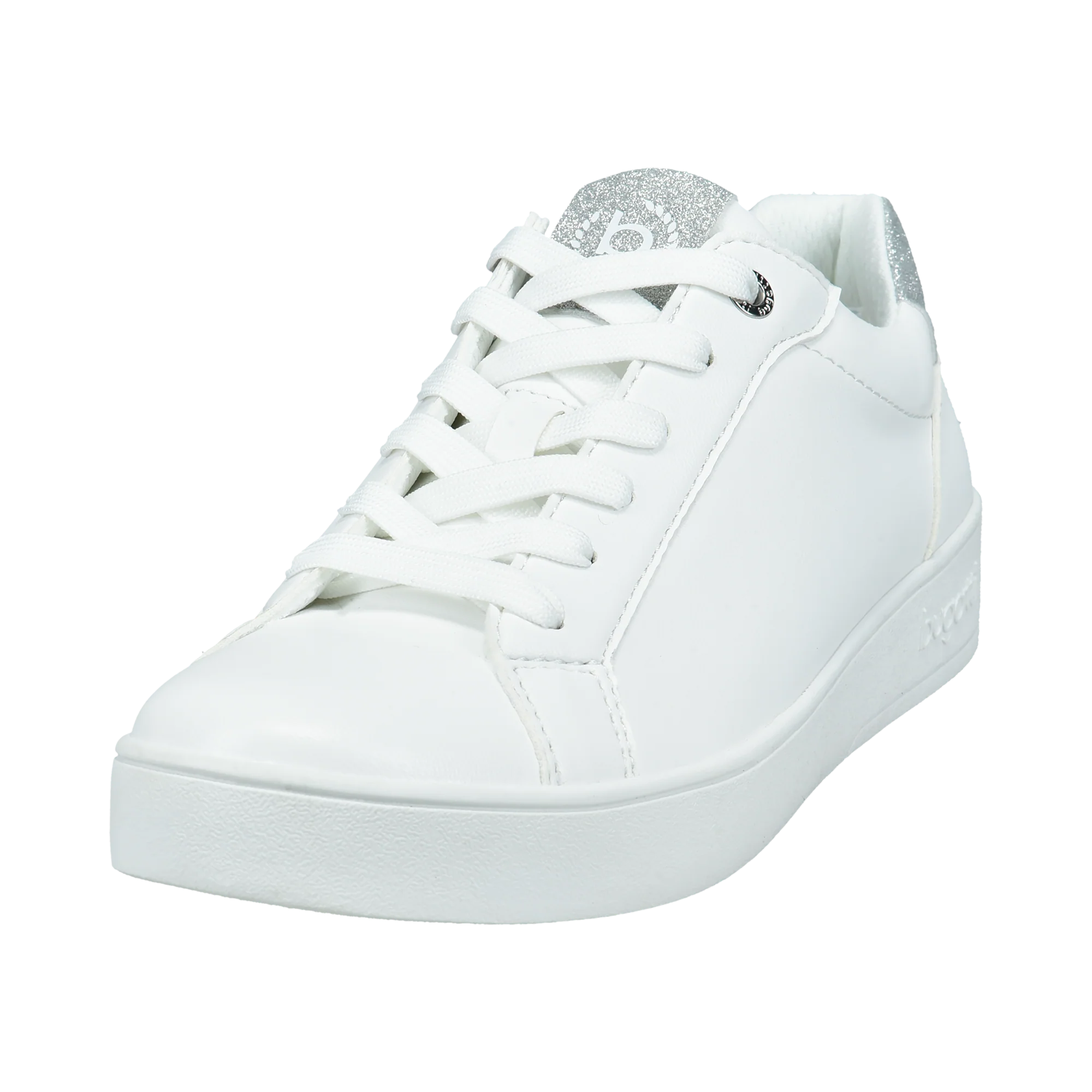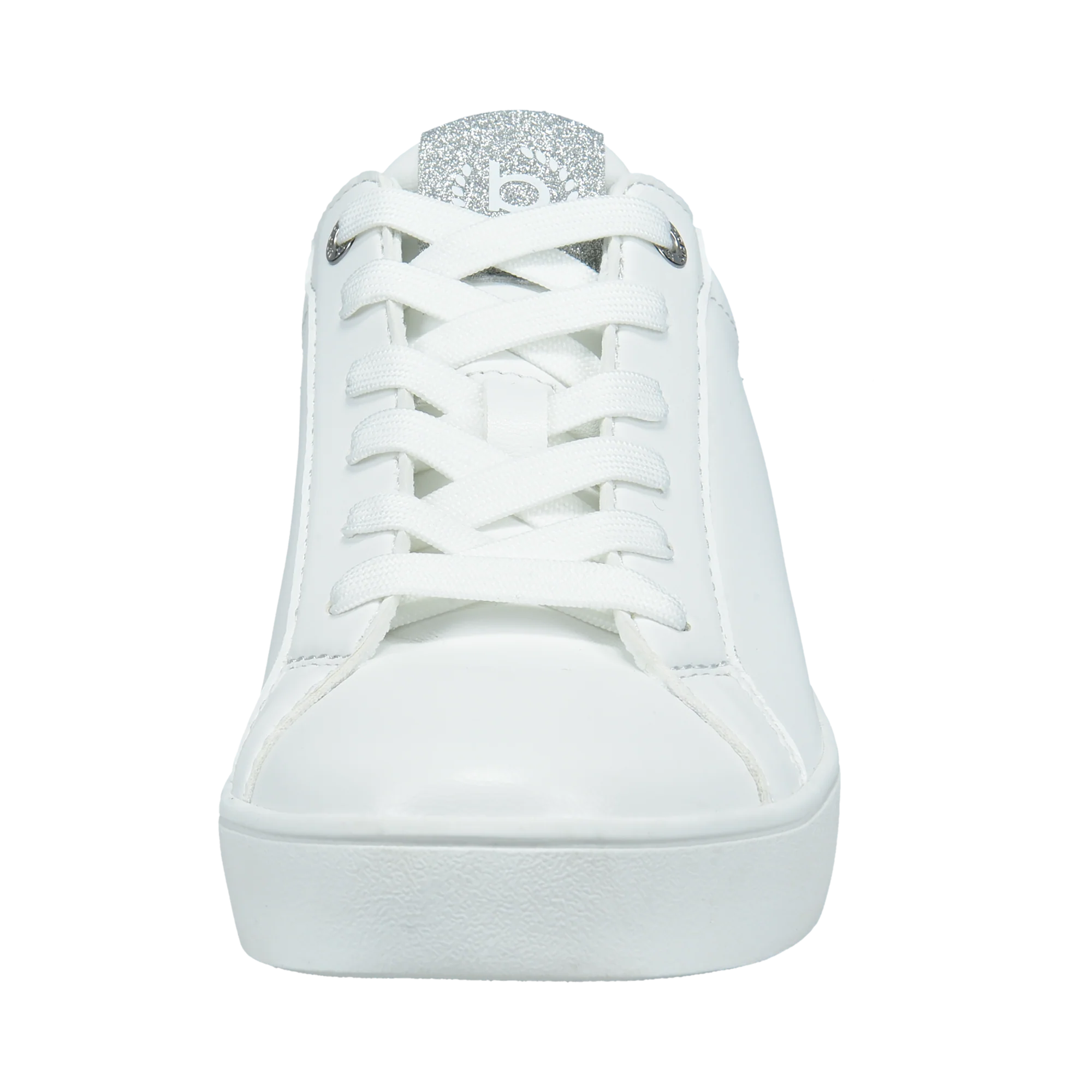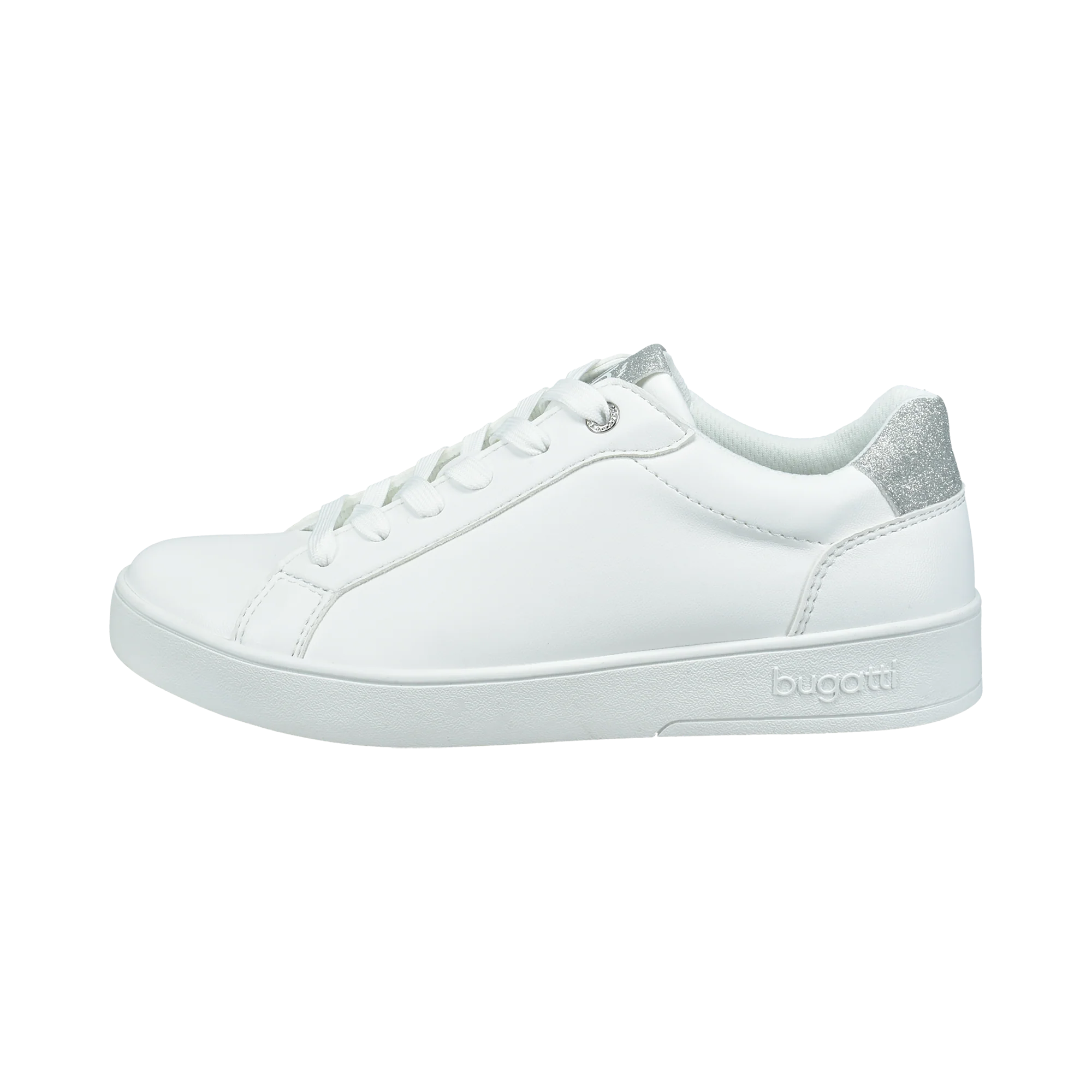 Ganz in weiß präsentiert sich der bugatti Sneaker mit einer auffälligen, silbern glitzernden Fersenkappe und einer leichten, flexiblen Laufsohle. Diese Sneakers bieten Stil und Komfort und sind eine vielseitige Ergänzung für jede Garderobe.
