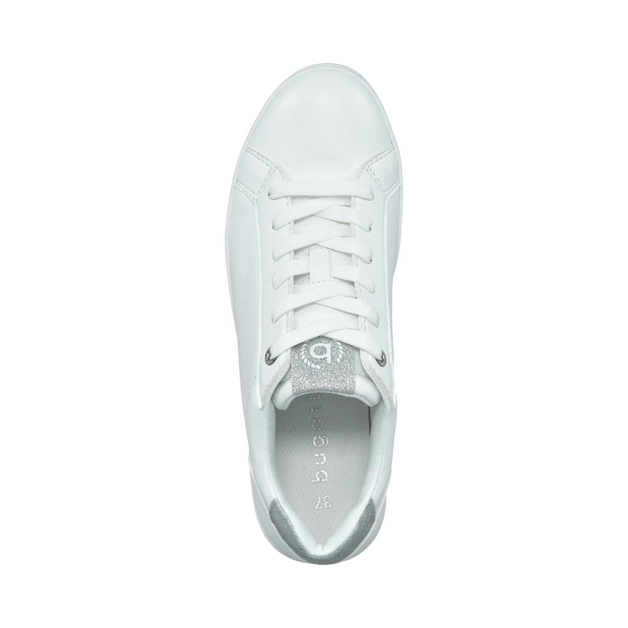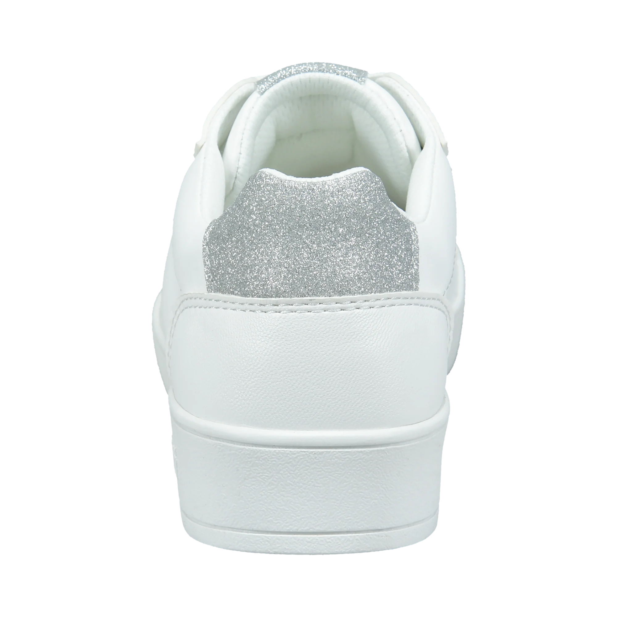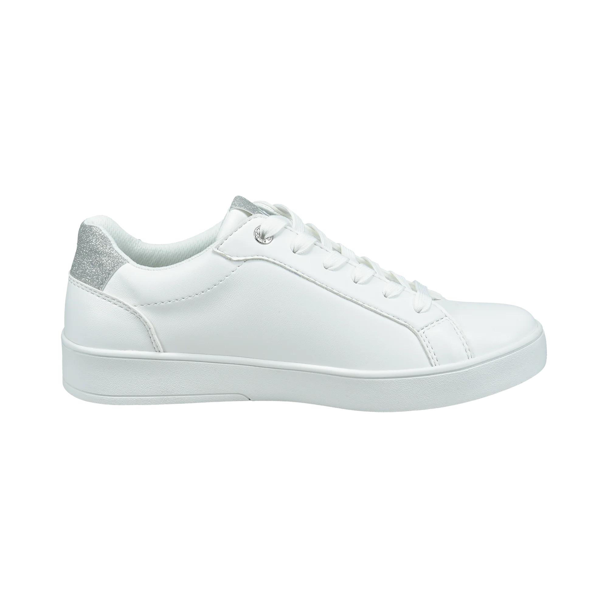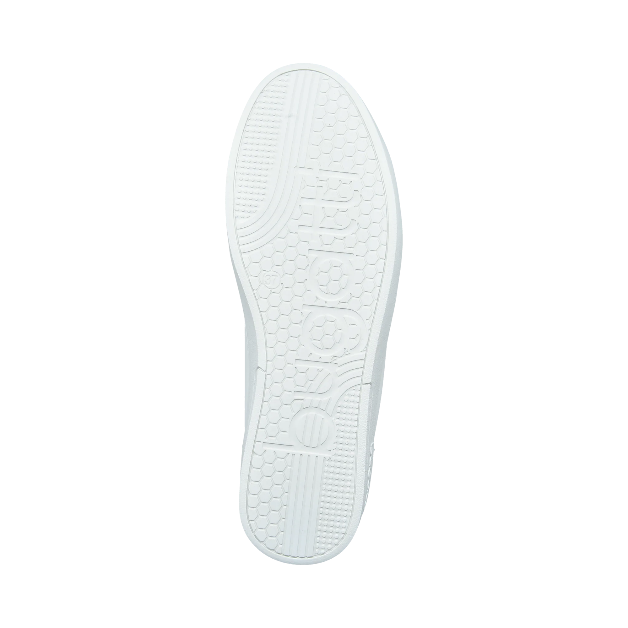 Ganz in weiß präsentiert sich der bugatti Sneaker mit einer auffälligen, silbern glitzernden Fersenkappe und einer leichten, flexiblen Laufsohle. Diese Sneakers bieten Stil und Komfort und sind eine vielseitige Ergänzung für jede Garderobe.