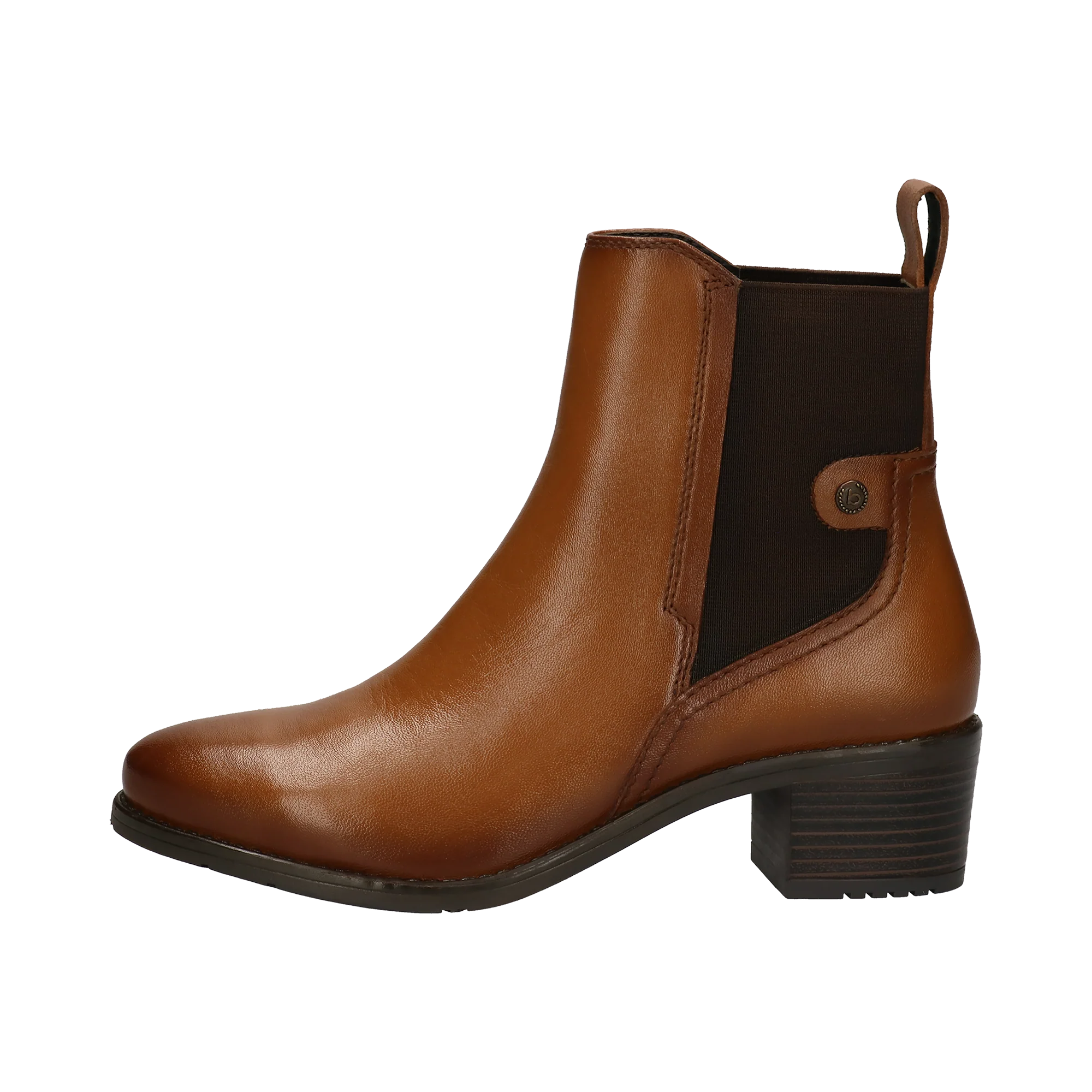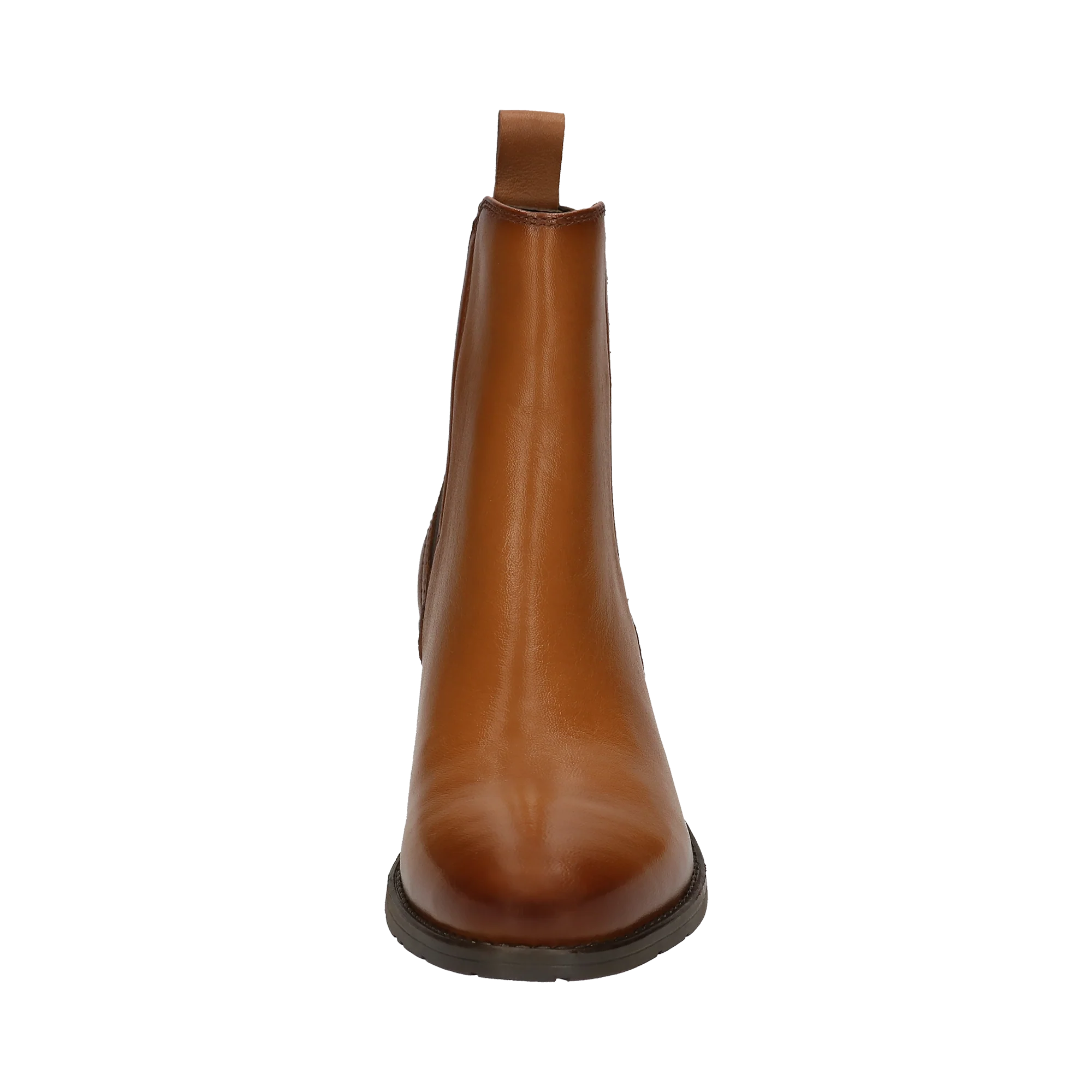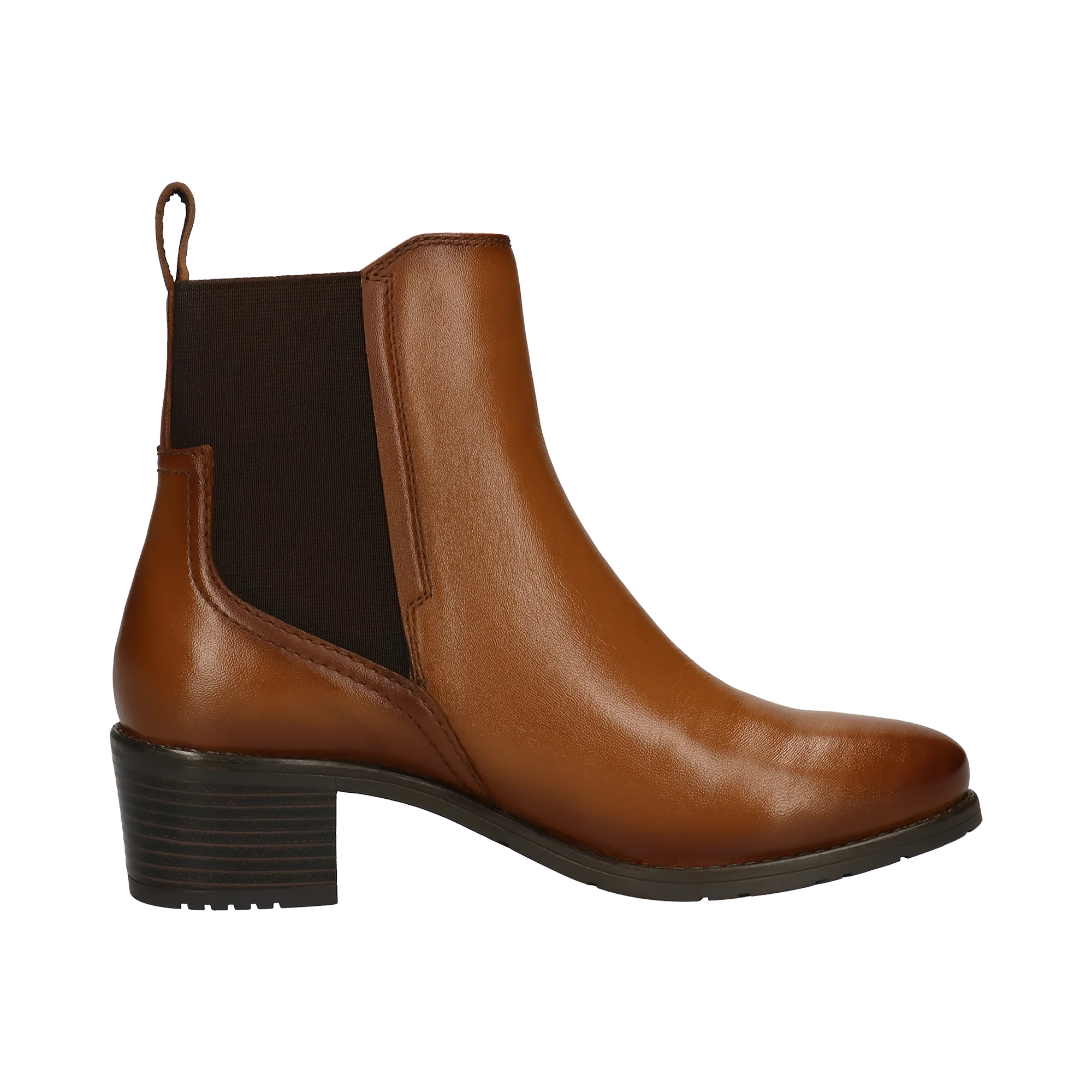Das Paar aus cognacfarbenem Nappaleder mit Blockabsatz verfügt über eine elastische Konstruktion, die an die Praktikabilität des Chelsea-Boots erinnert. Das Innenfutter und die Innensohle aus Textil, sowie eine leichte TPR-Sohle sorgen für mehr Komfort und Stabilität. Eine perfekte Stiefelette, die perfekt zu Jeans-Outfits passt.