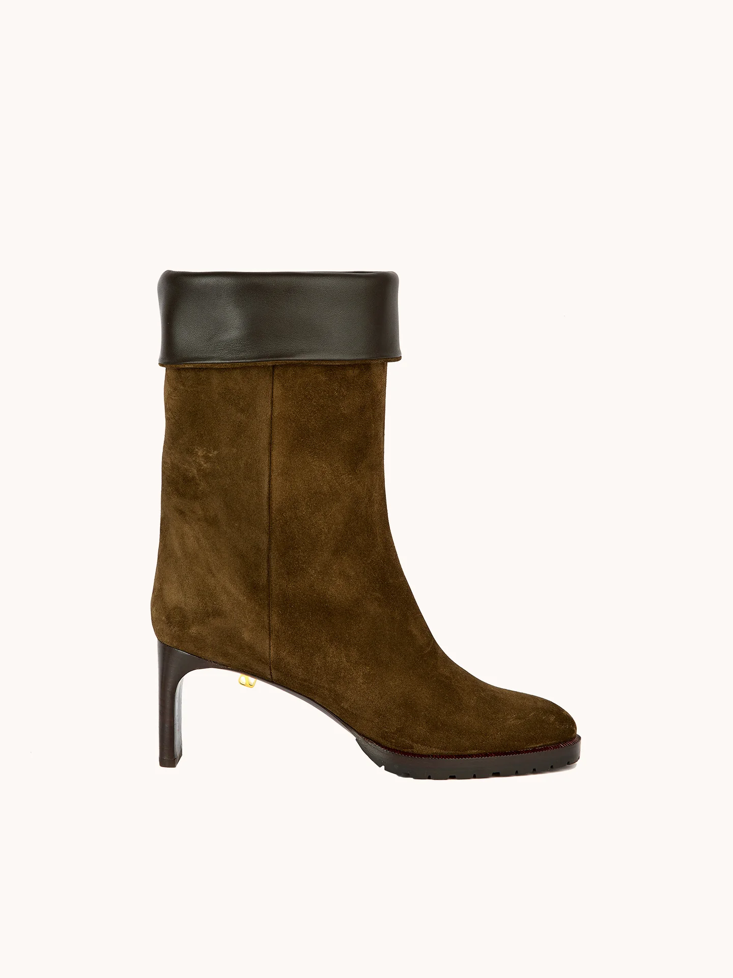Bottes Victoria en suède vert et talon moyen – Maison Skorpios par Adriana Abascal