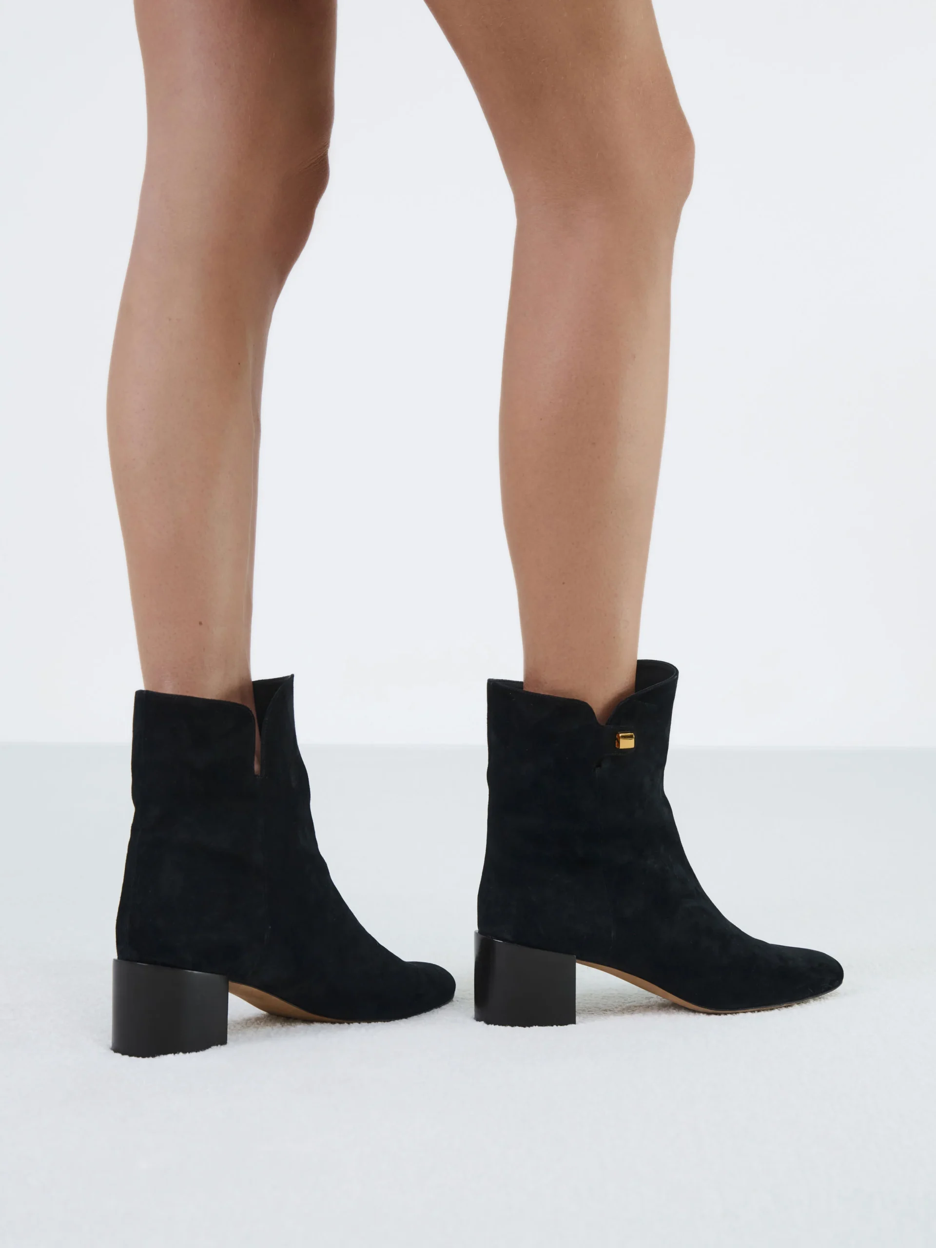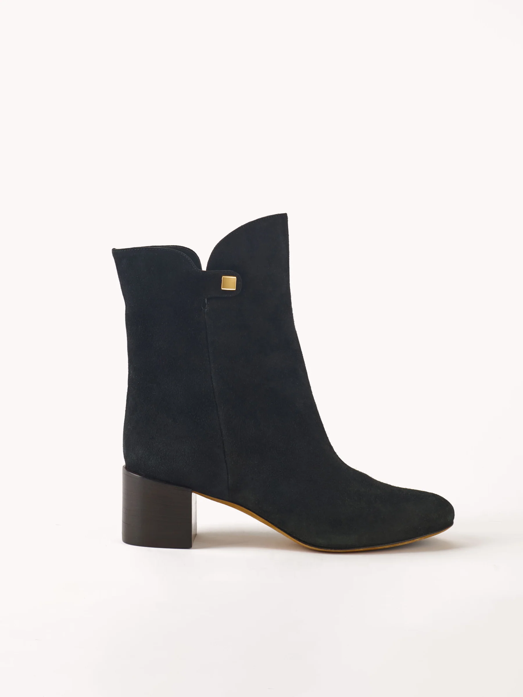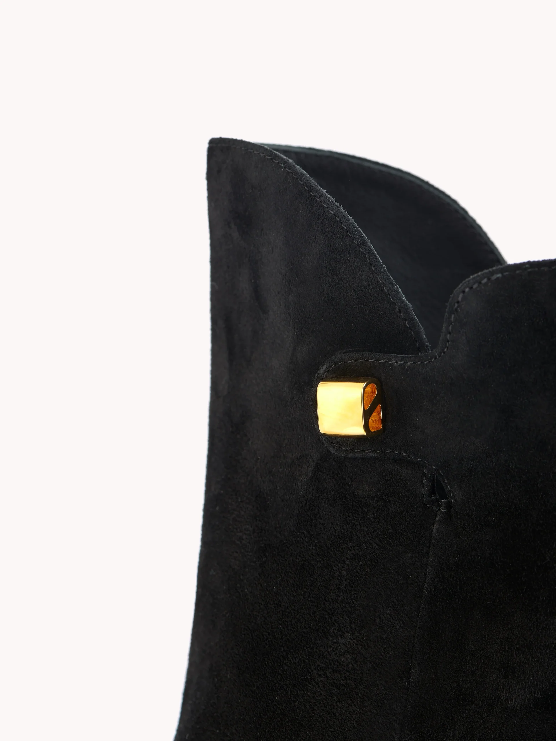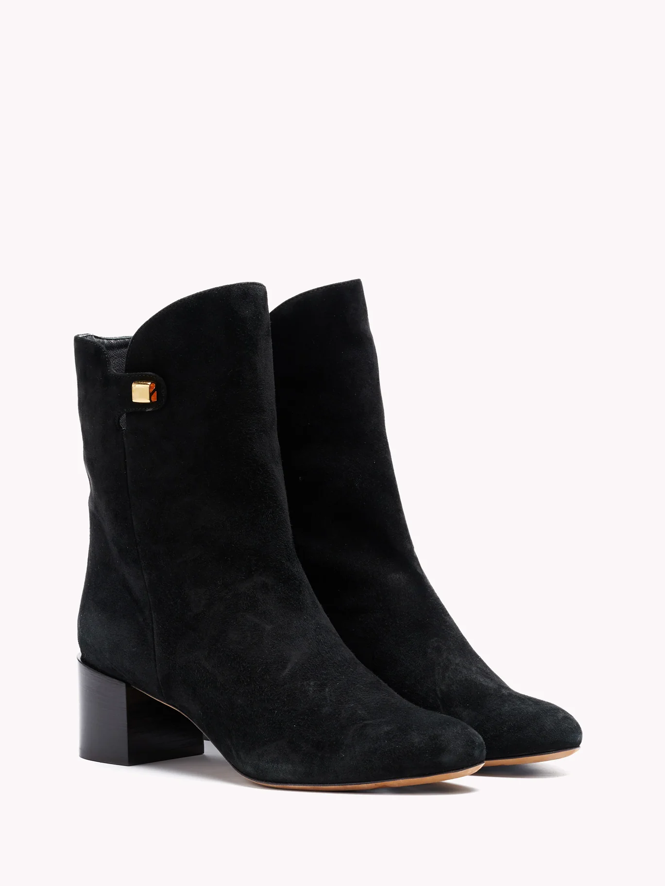 Cette bottine classique en daim est dotée d’un élégant bout rond et de nos ornements dorés emblématiques sur le côté.