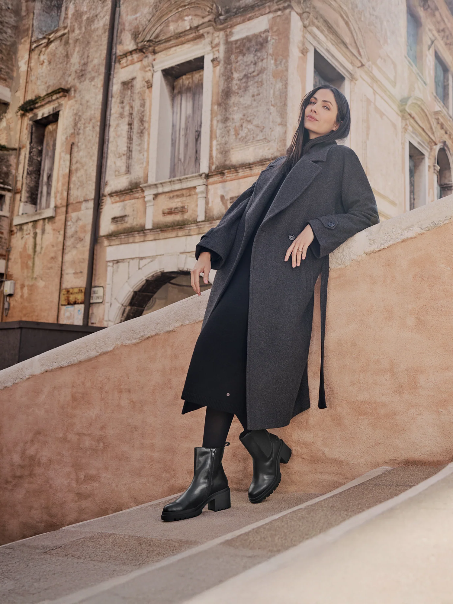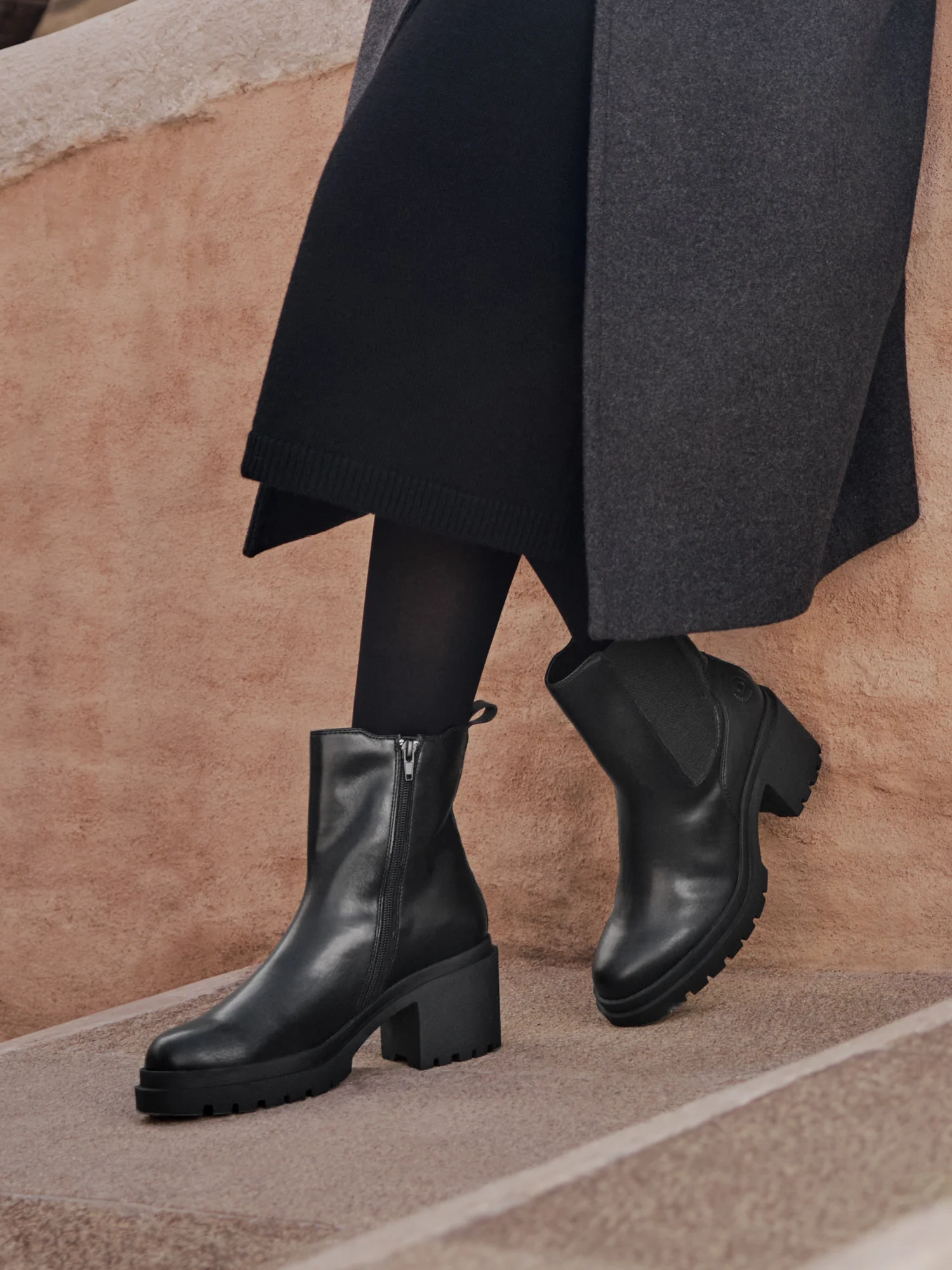 Diese schwarzen Stiefel aus der Joy-Gruppe sind die perfekte Wahl für Business- und City-Looks. Sie passen sich den modischen Vorlieben moderner Frauen an. Dank ihrer leichten Konstruktion garantieren sie unvergleichlichen Komfort und eignen sich dadurch ideal für längeres Tragen – ob bei Meetings im Büro oder während eleganter Anlässe. Mit ihren klaren, minimalistischen Linien und ihrem stabilen Blockabsatz zeichnen sie sich durch eine ausgewogene Ästhetik aus und verbinden zugleich feminine Anmut mit einem charmanten, urbanen Touch. Mit diesem Paar erhältst Du mehr als nur Stiefel – Du setzt vielmehr ein wahres Stil-Statement!