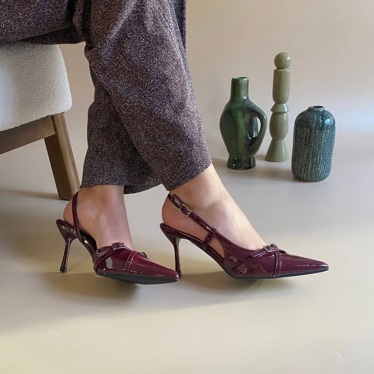 Escarpin en cuir synthétique effet brillant avec motifs ceintures.