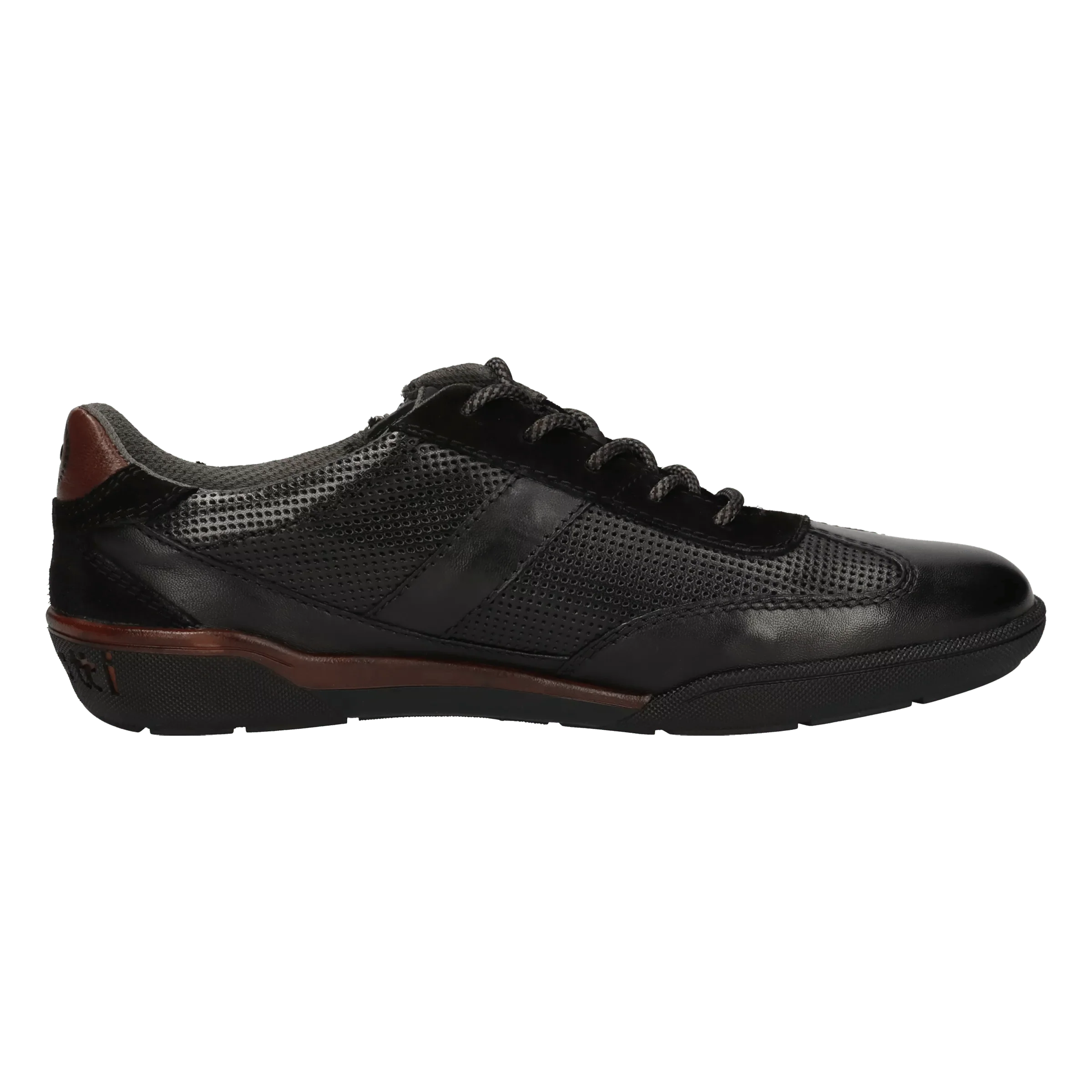 Modische Linien, bequemer Halt – Der coole Schnürer der Gruppe Lake in Schwarz mit braunen Akzenten sorgt für Komfort dank dem speziellen, austauschbaren Wechselfußbett und der Passform, während der Used Look und der Zierreißverschluss an der Seite ihm einen trendigen Schliff verleiht.