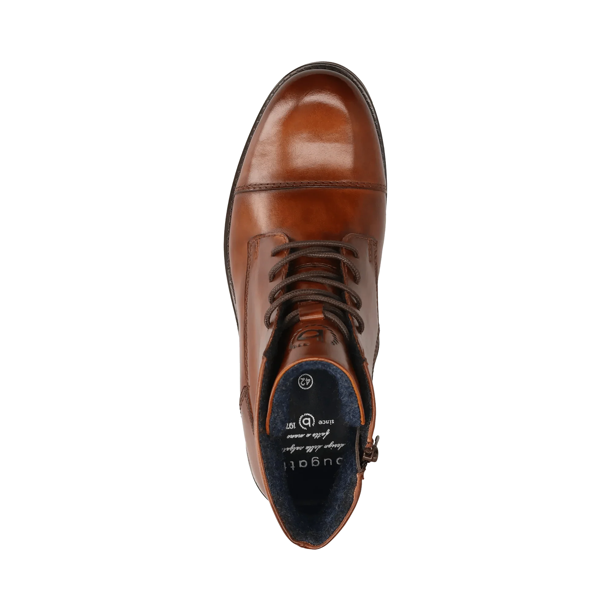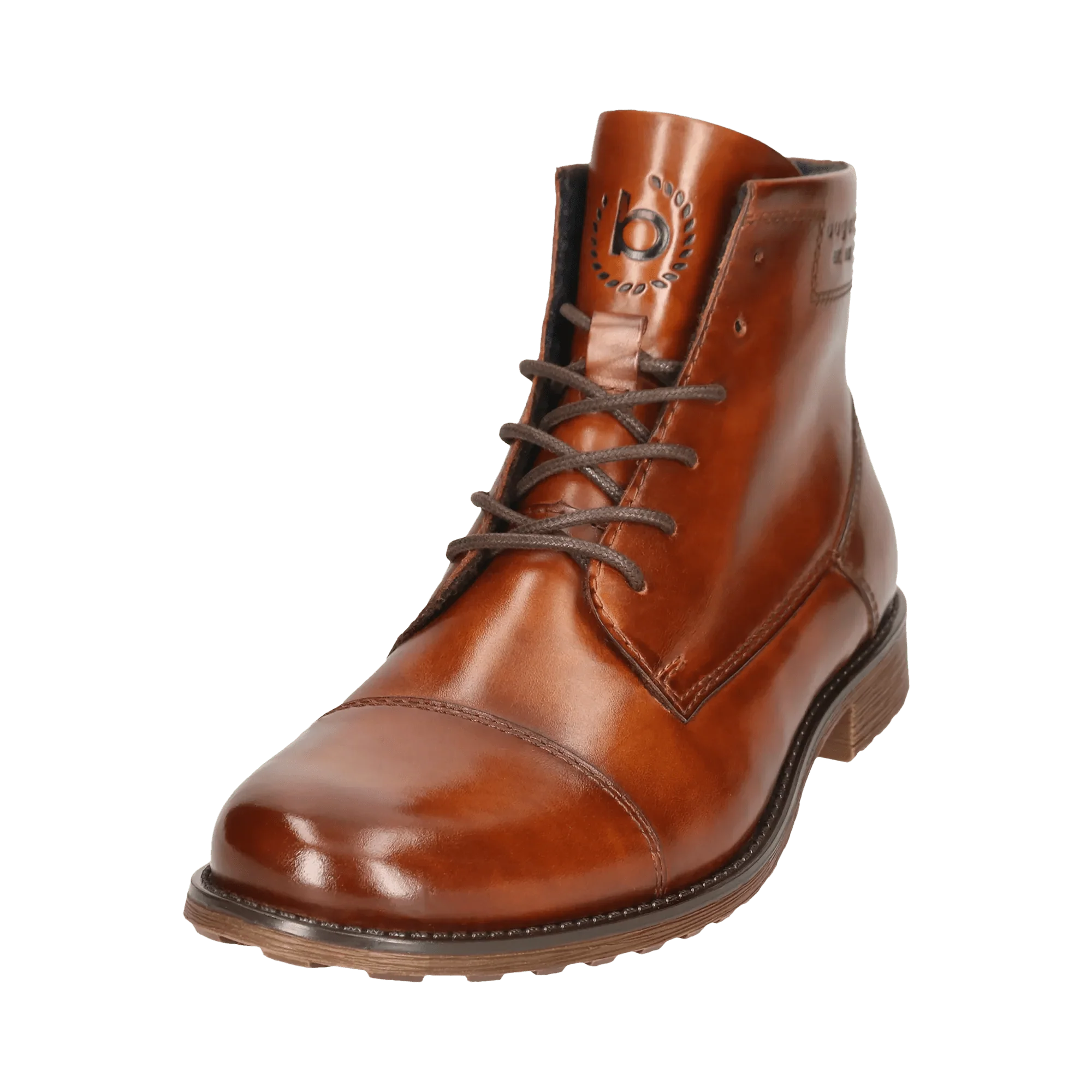 Die Lederstiefel der Gruppe Catano sind mit einer Kappe und einer Logoprägung versehen, die jedes Kleidungsstück unterstreicht. Diese cognacbraunen Stiefel verfügen über eine Schnürung und einen Reißverschluss, der ein elegantes, in zwei Tönen ausgearbeitetes Hand Finish zur Geltung bringt. Diese Herrenstiefel mit Vintage-Charakter werden mit Sorgfalt hergestellt, damit sie einfach zu pflegen sind und lange halten.