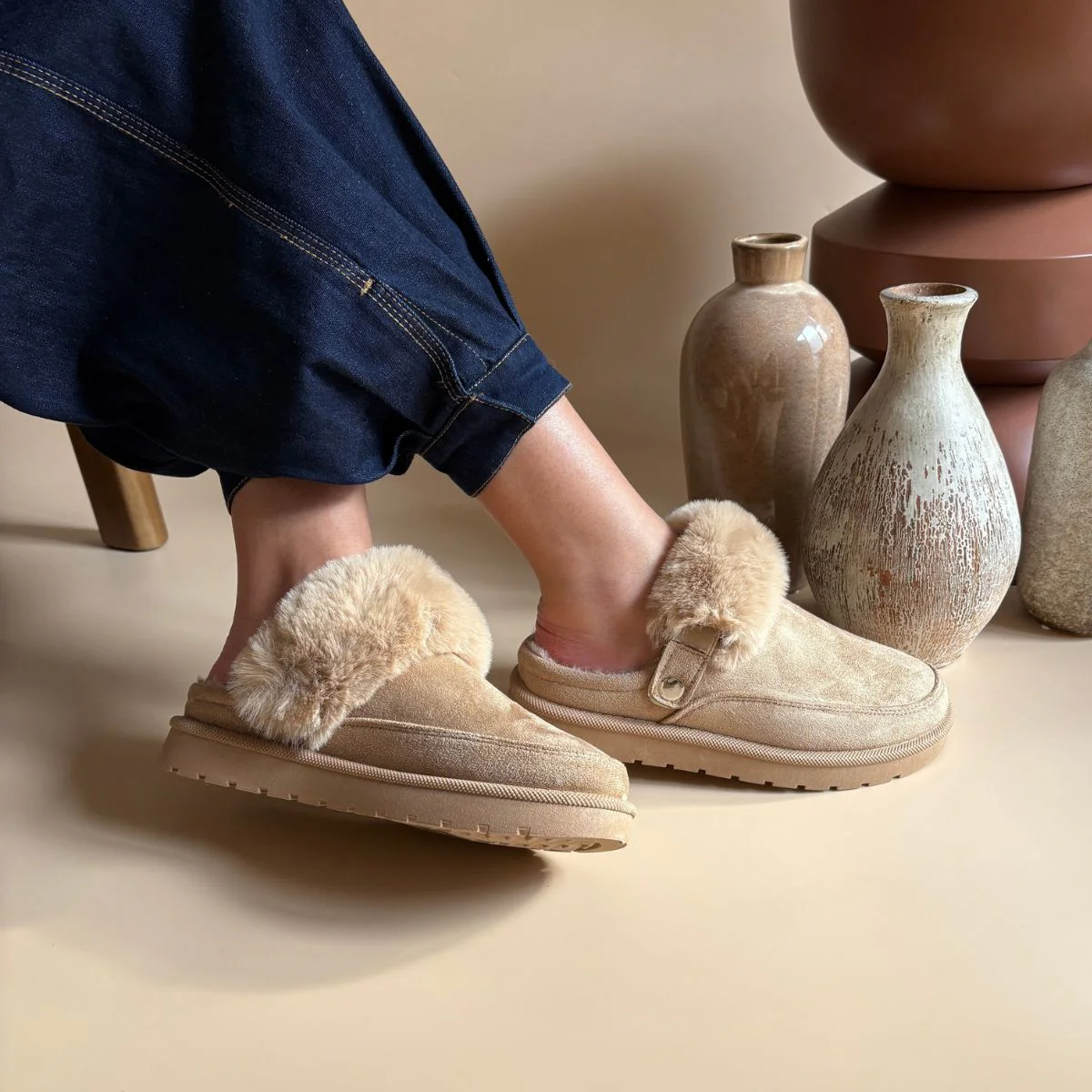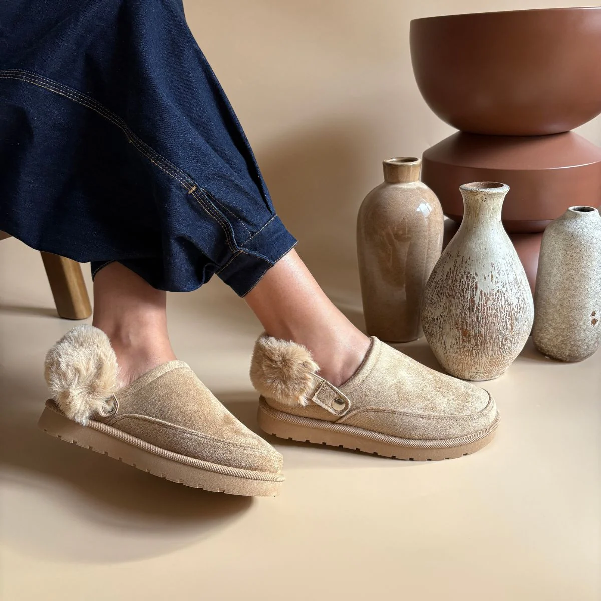 Mules en daim couleur camel. Se porte de 2 manières différentes.