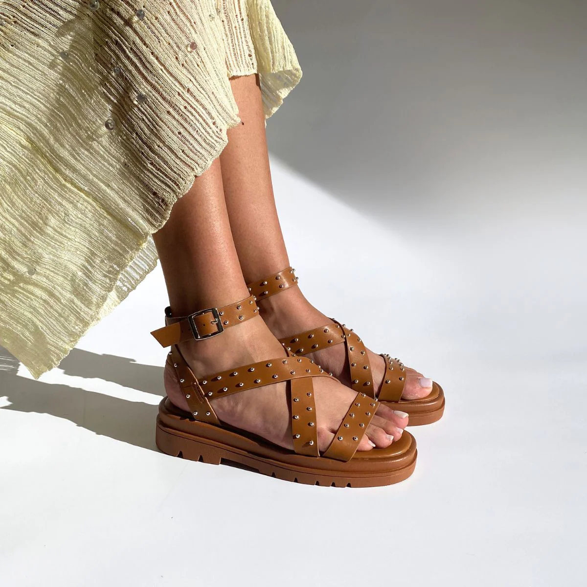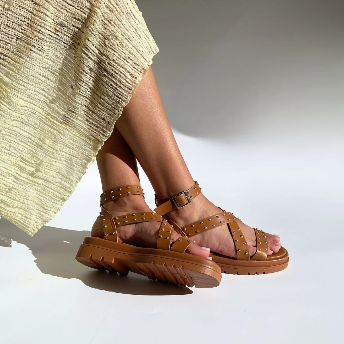 Sandale Chunky à lanières en cuir synthétique couleur camel.