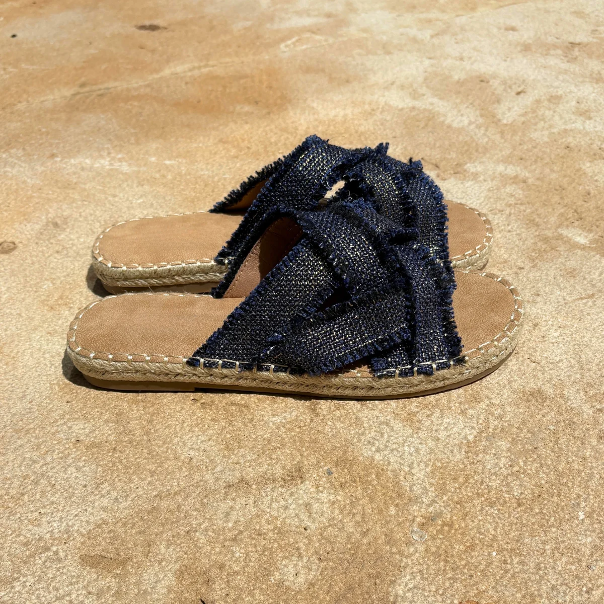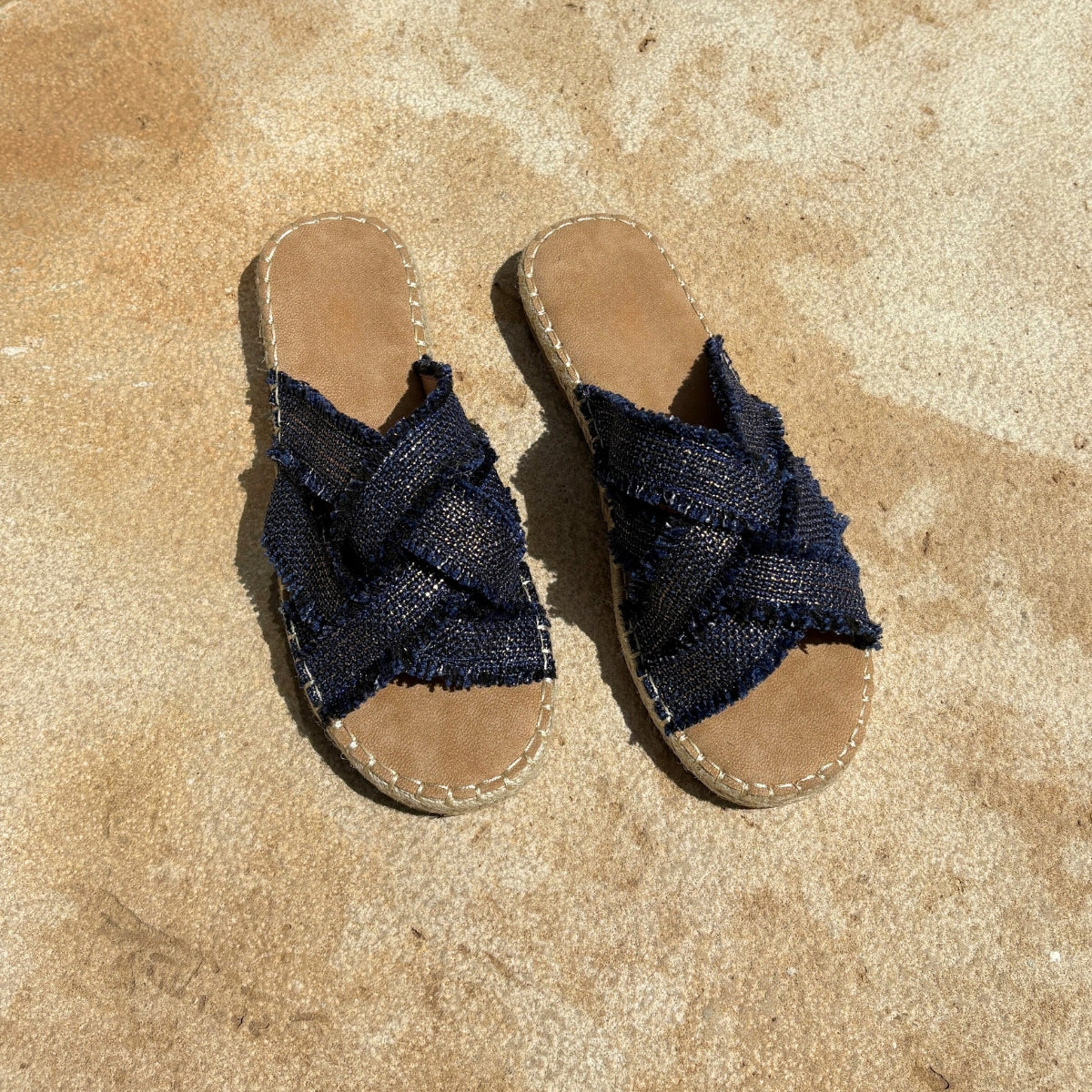Sandales plates en raphia et tissu couleur bleu nuit et fil en gold.