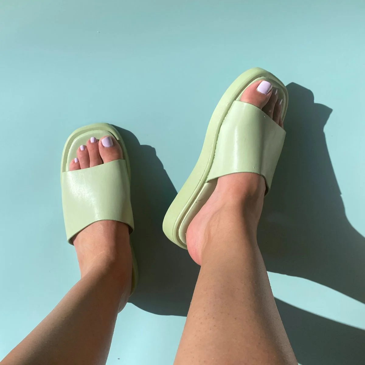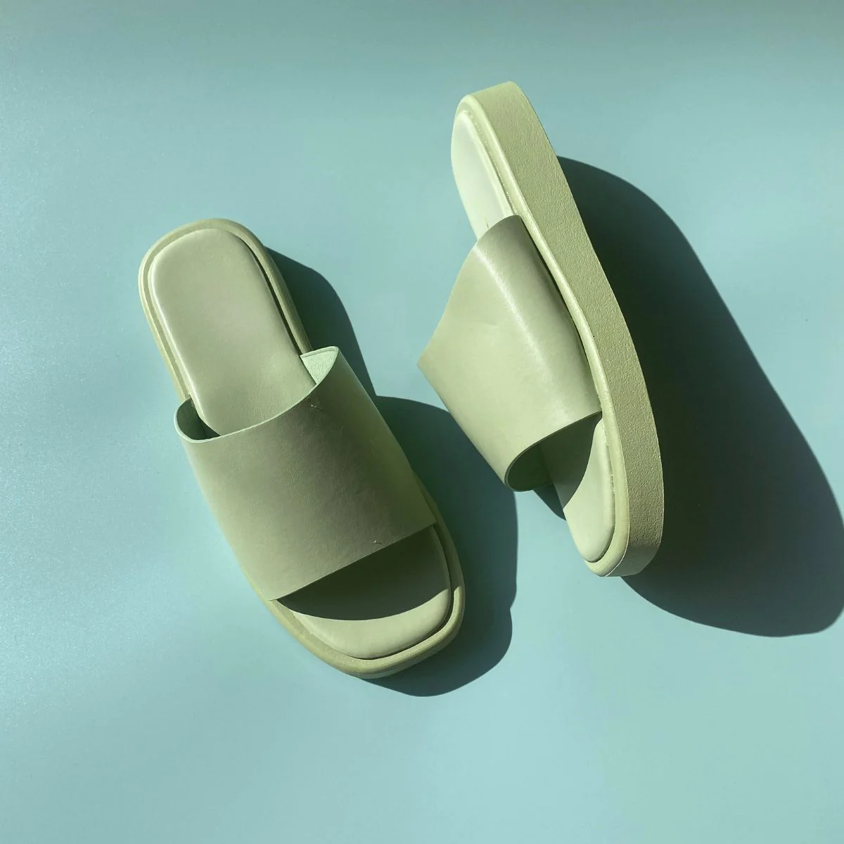 Sandales plates en cuir synthétique et en caoutchouc disponible en blanc et rose.