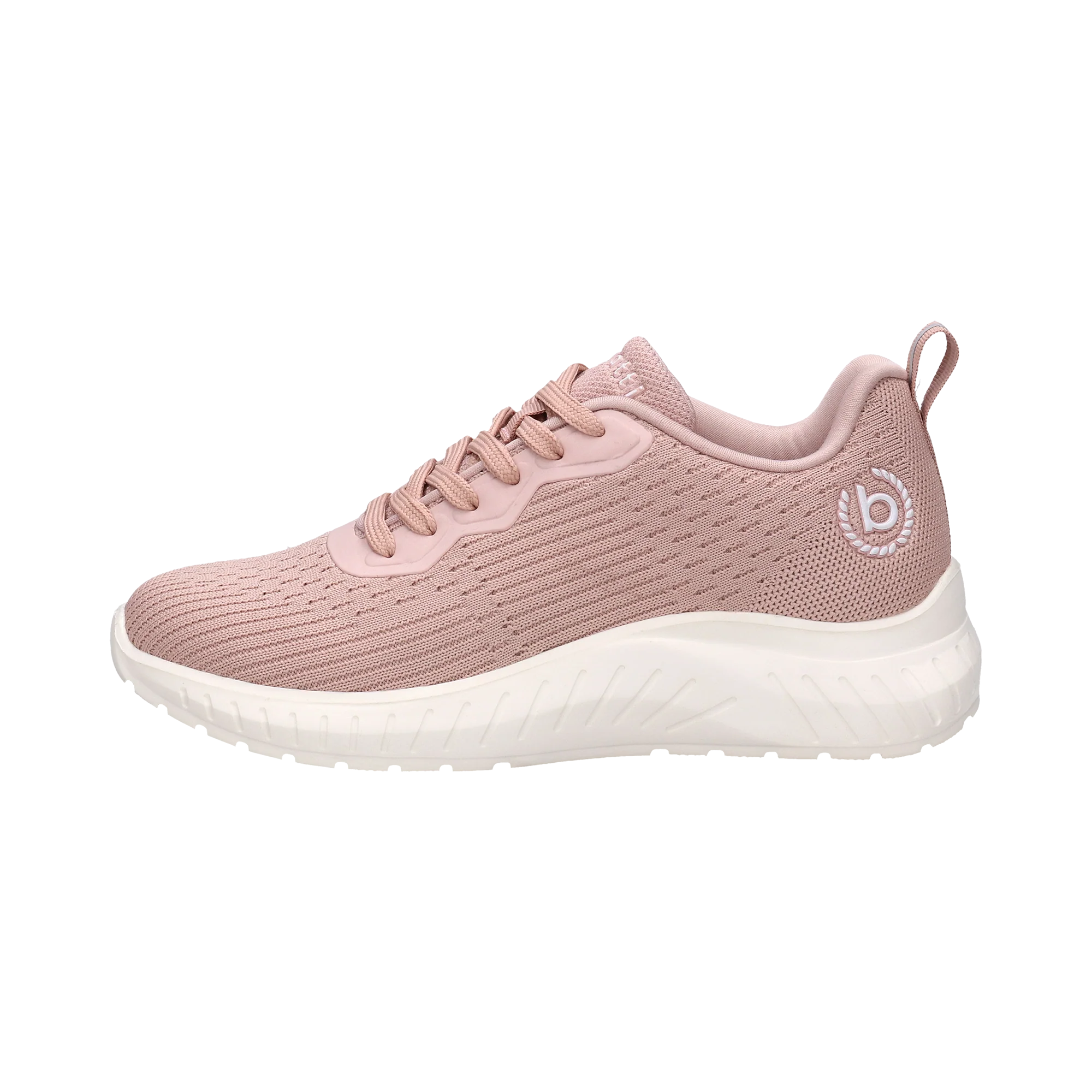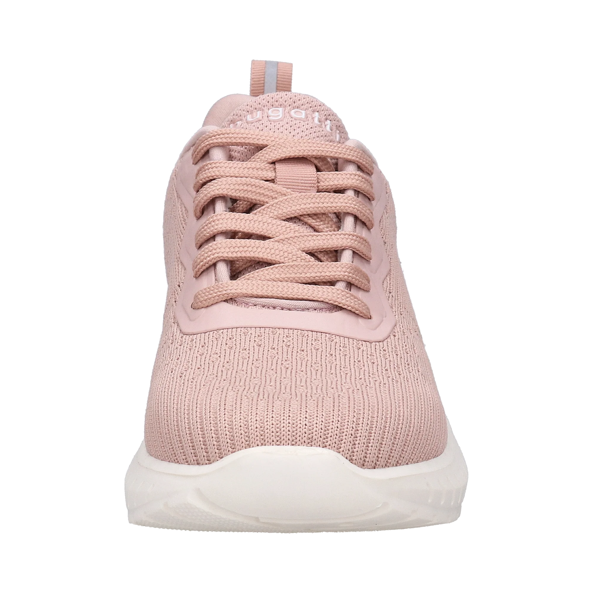 Damen Sneaker aus rosafarbenem Flechtmaterial mit Gummischoner entlang der Schnürsenkel und Pull-up Lasche zum vereinfachten Anziehen. Das Richtige für aktive Tage, wenn die Sohlen sehr gut dämpfen und flexibel auf den Untergrund reagieren.