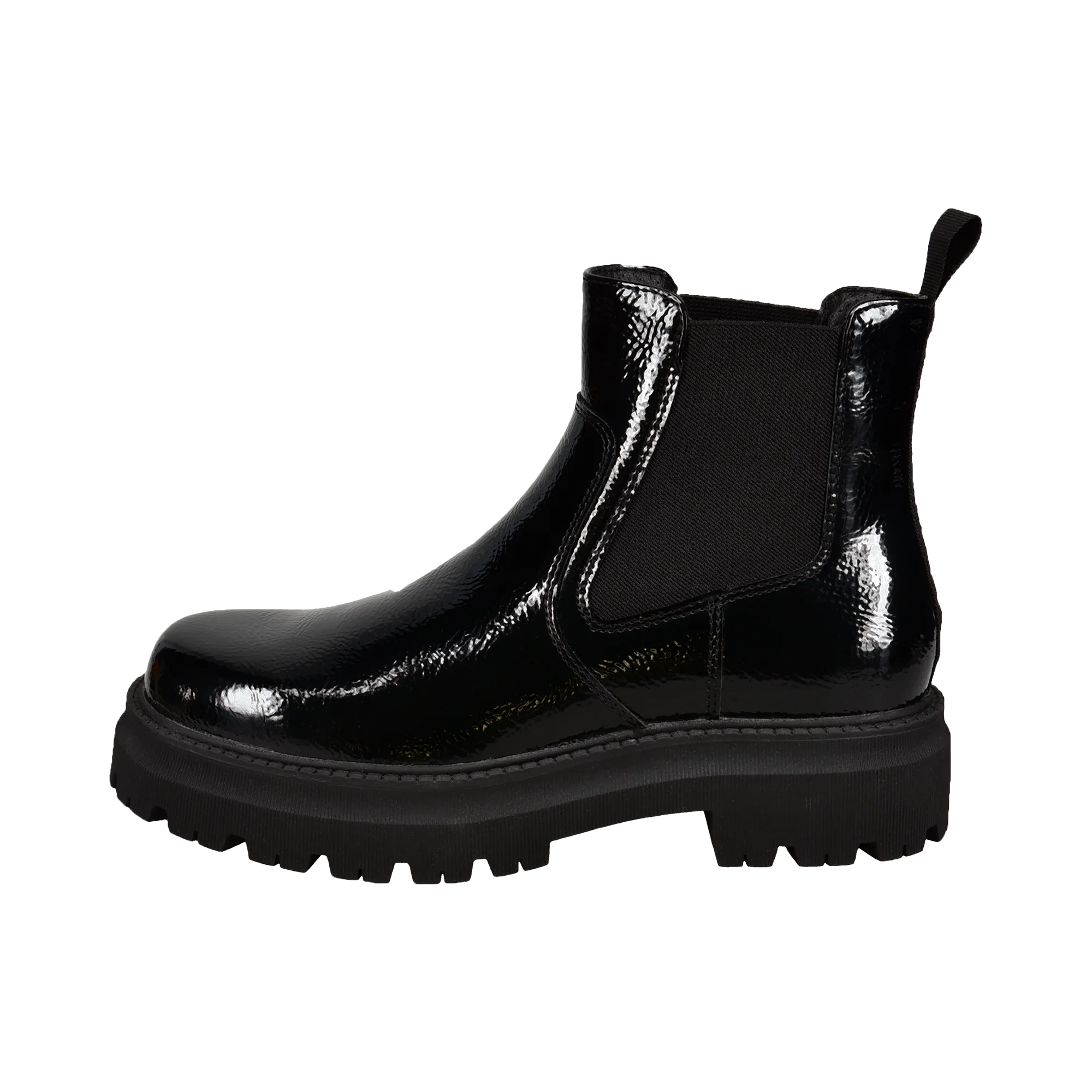 Diese Chelsea Boots in Lackoptik sind elegant und edel in Schwarz. Die Combat-Sohle verleiht dem Design einen eleganten Schick. Diese Stiefel sind ein mutiges Statement und runden jedes Outfit perfekt ab. Mit ihrem schlichten Schnitt und der praktischen Schnürlasche bieten sie Stil und Komfort für ein angenehmes Tragegefühl.