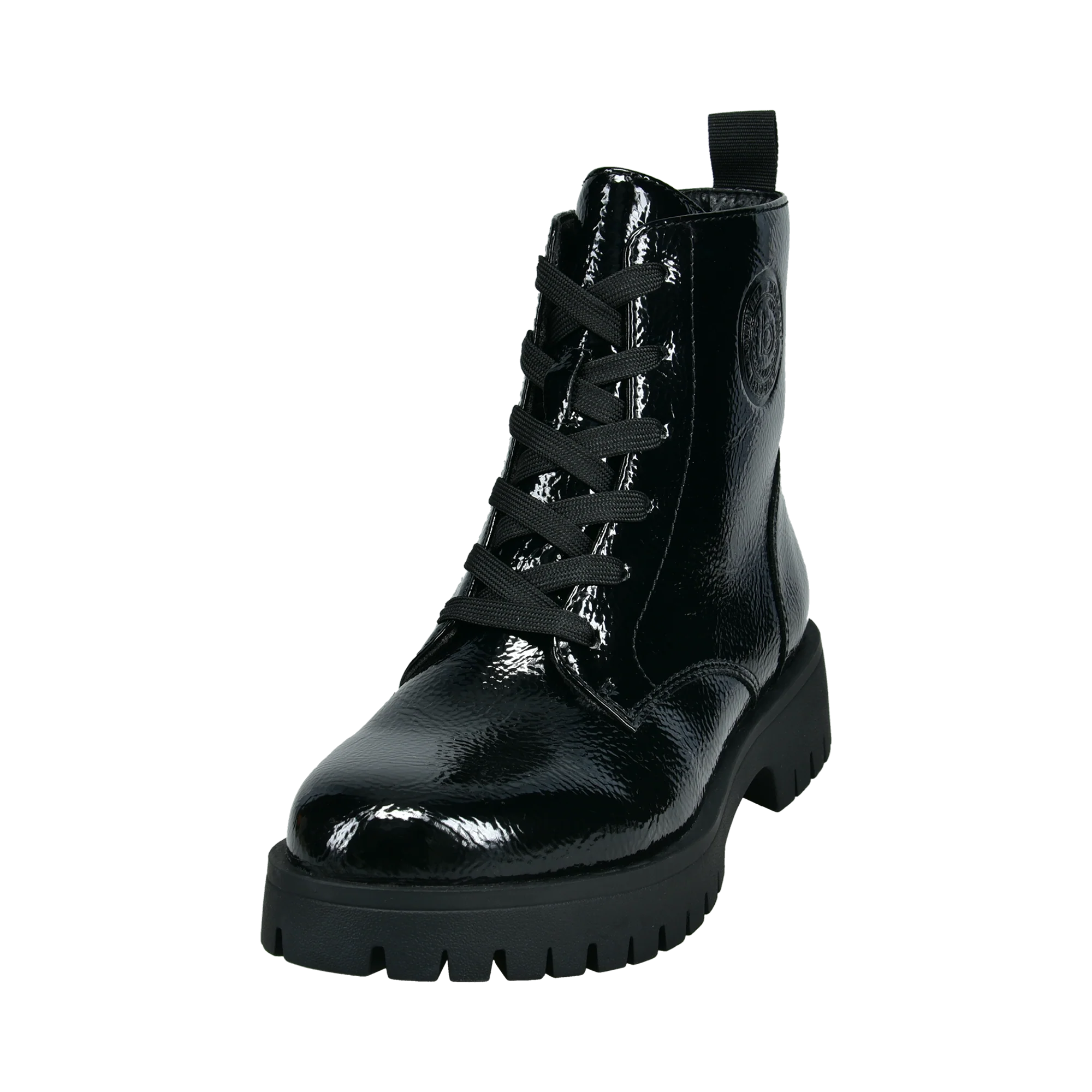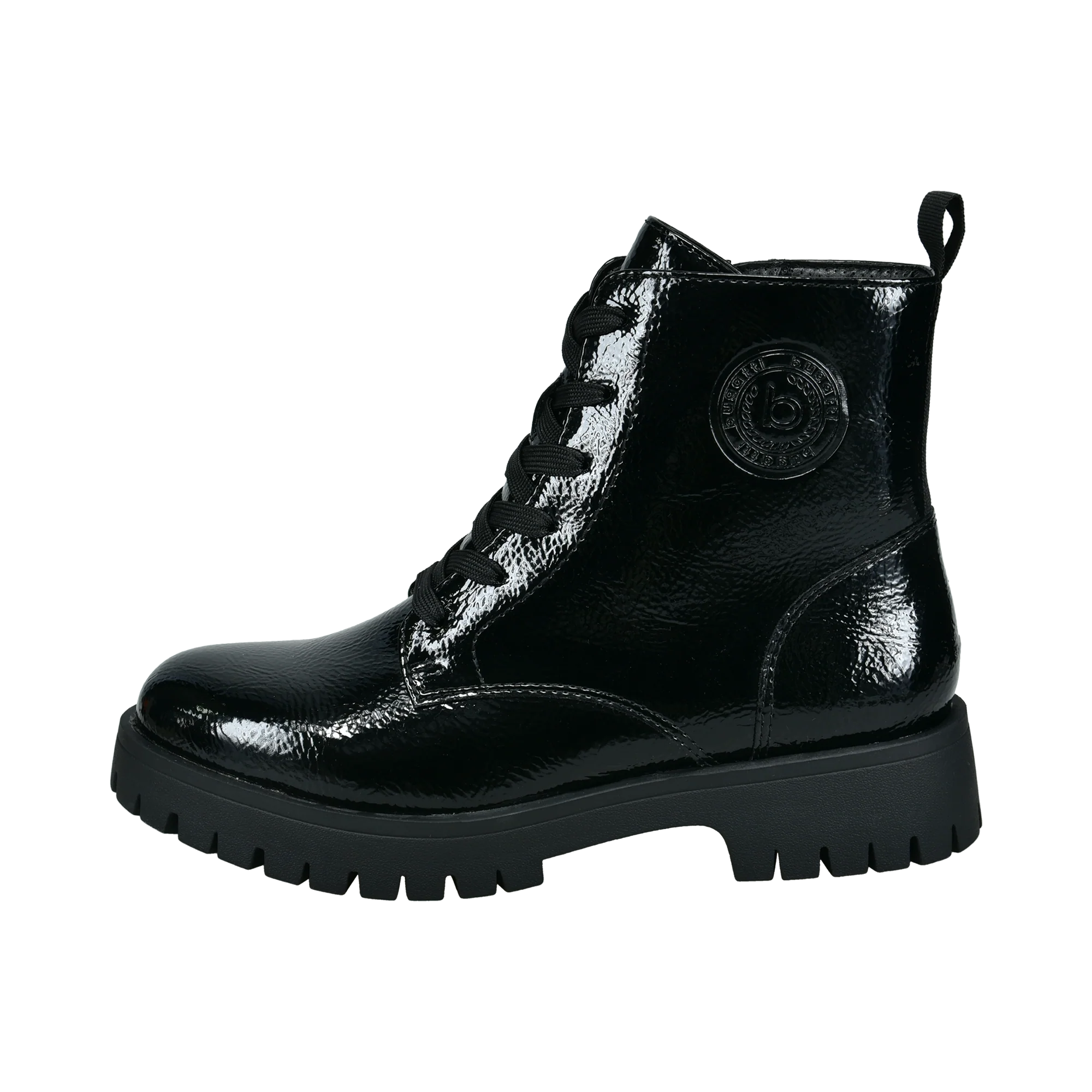Diese knöchelhohen Militärstiefel haben ein elegantes und stilvolles glänzendes Finish in klassischem Schwarz. Die gezackte Sohle bietet einen hervorragenden Halt und ist somit für jedes Gelände und jedes Wetter geeignet. Diese Stiefel sind die perfekte Ergänzung zu jedem Jeans-Outfit und verleihen ihm einen robusten und kantigen Look, der auffällt.