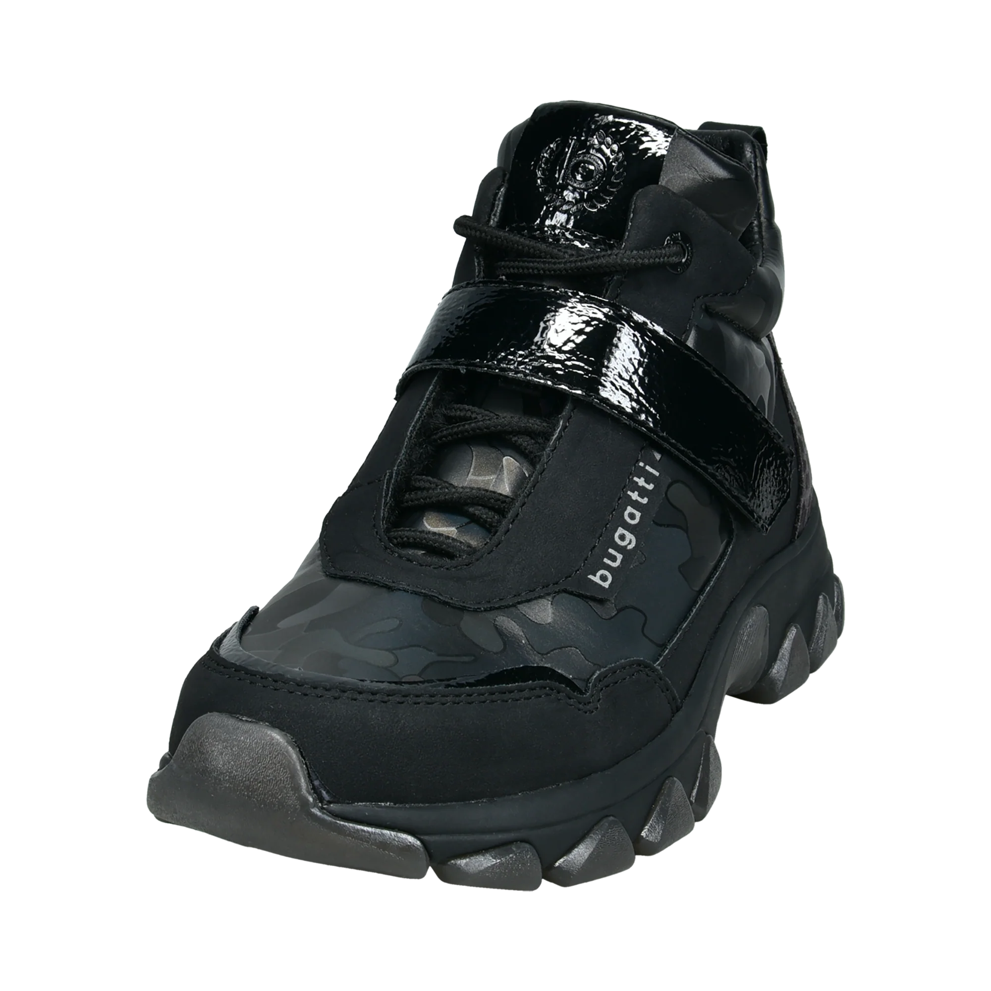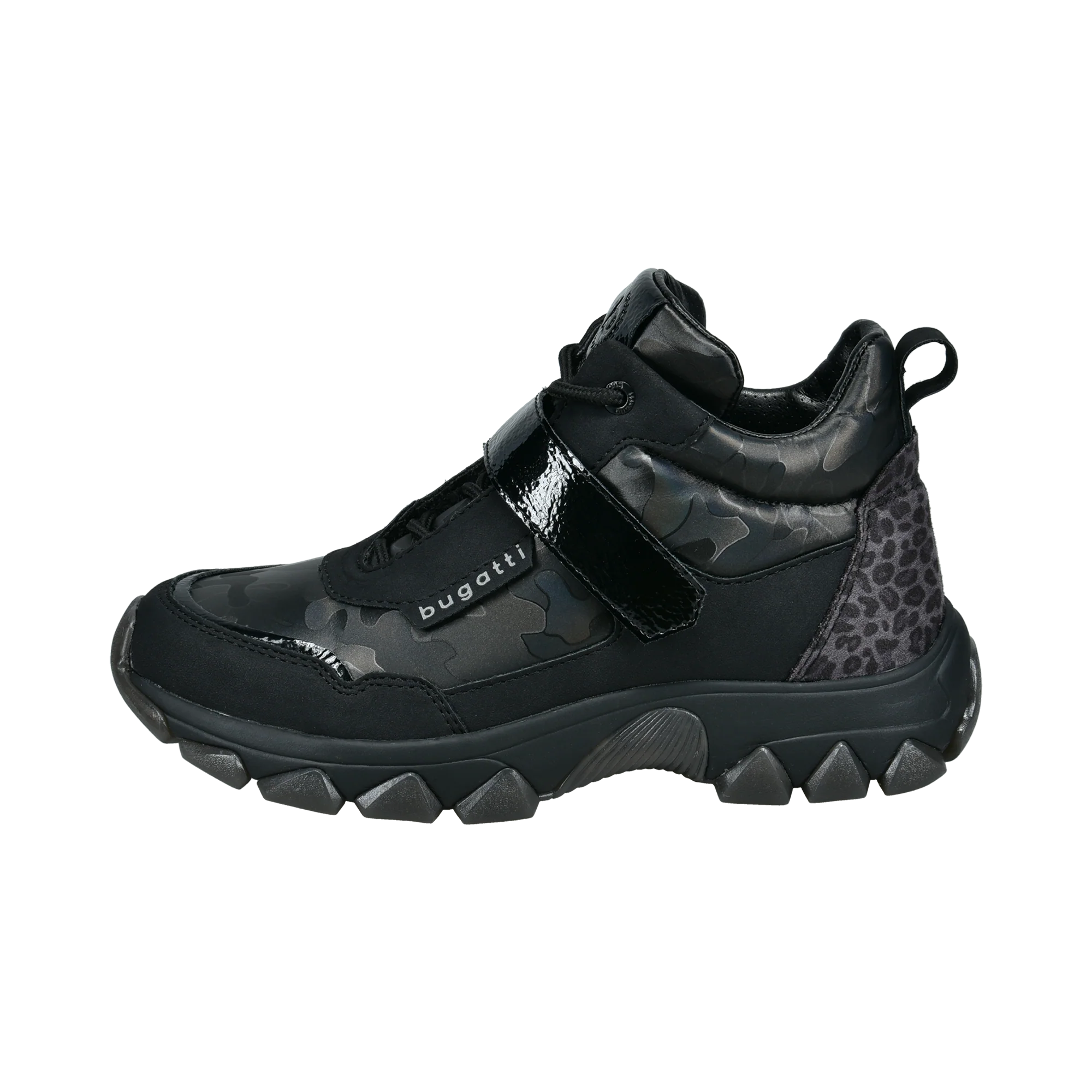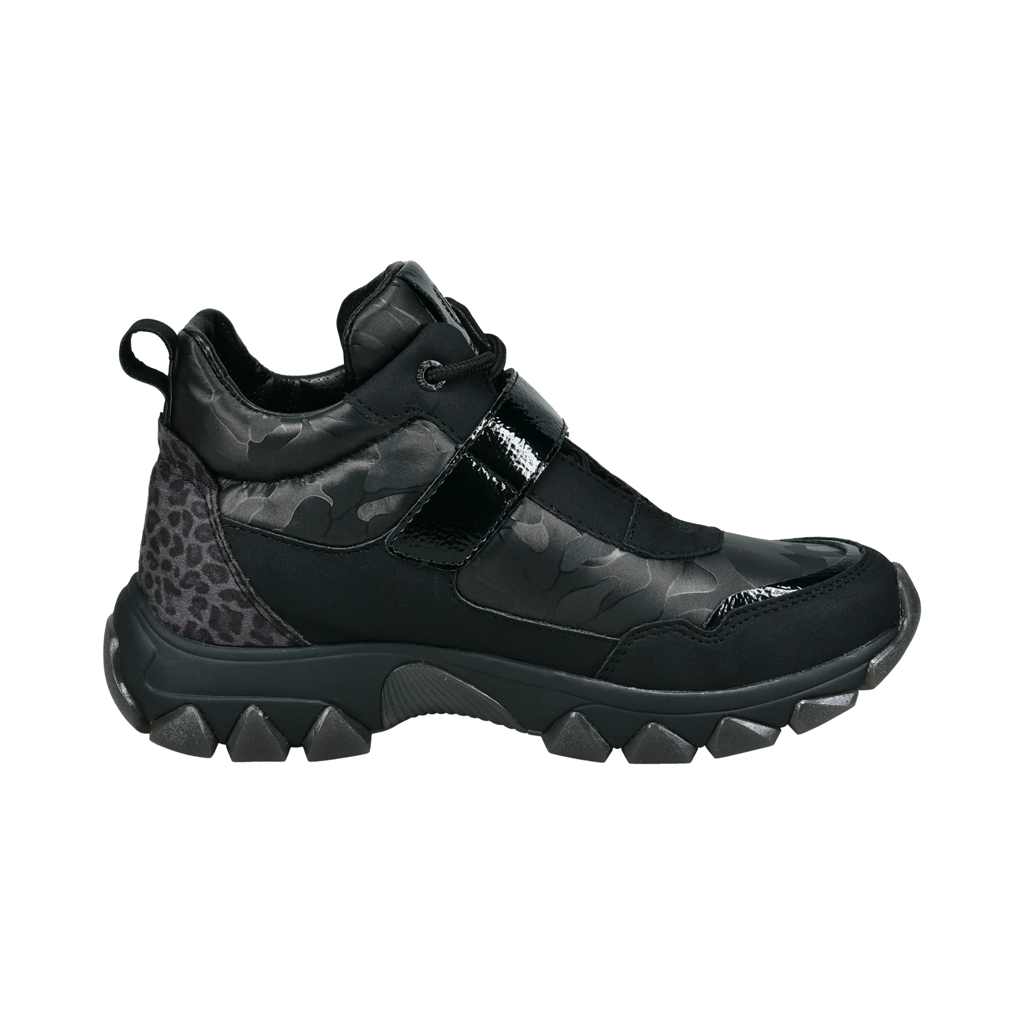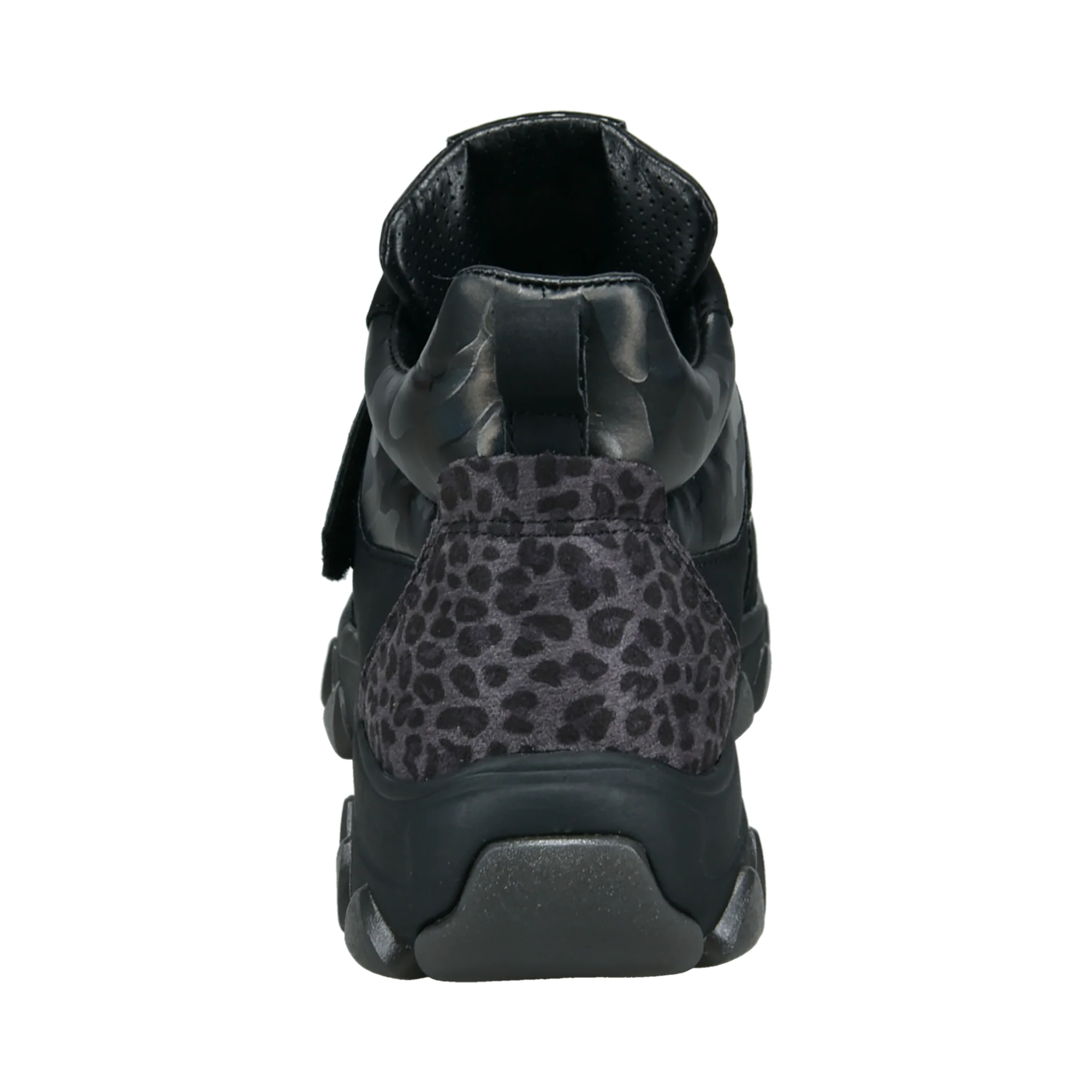 Dieser coole Damenstiefel aus schwarzem Synthetikmaterial hat eine Fersenkappe mit Animal-Print und ein Fellfutter. Sie haben eine Schnürung für eine individuelle Passform und eine dünne Laufsohle. Unser Logo ist seitlich aufgedruckt. Eine moderne Wahl zur Bereicherung der eigenen Schuhkollektion.
