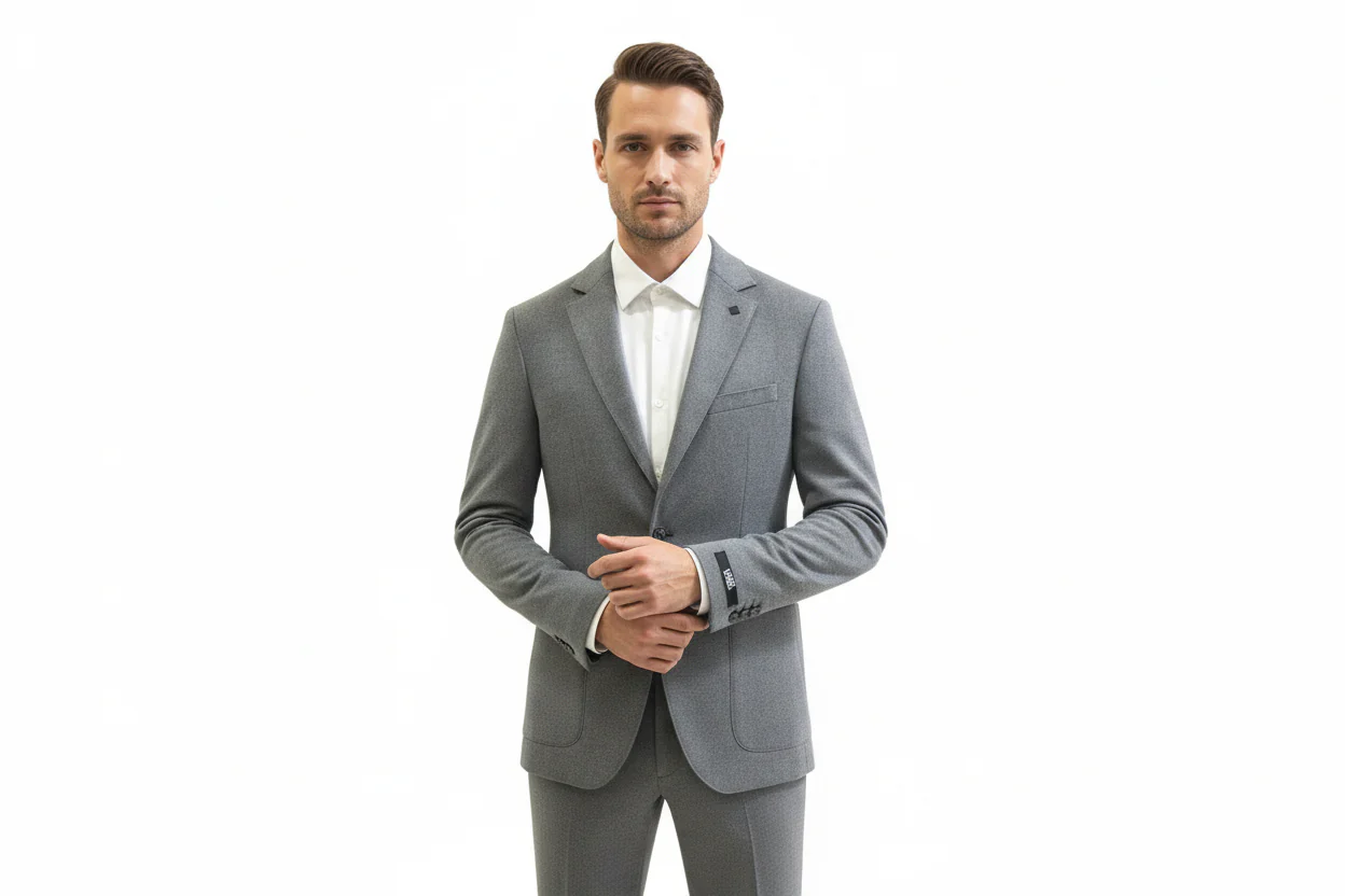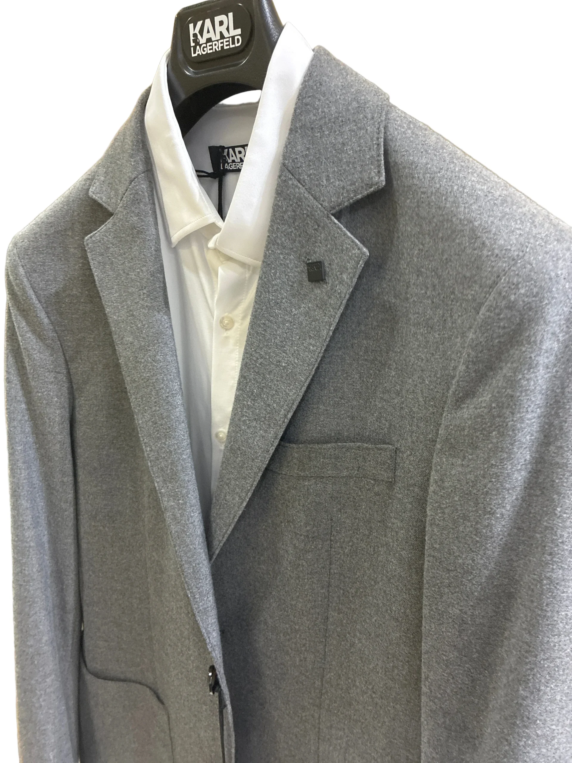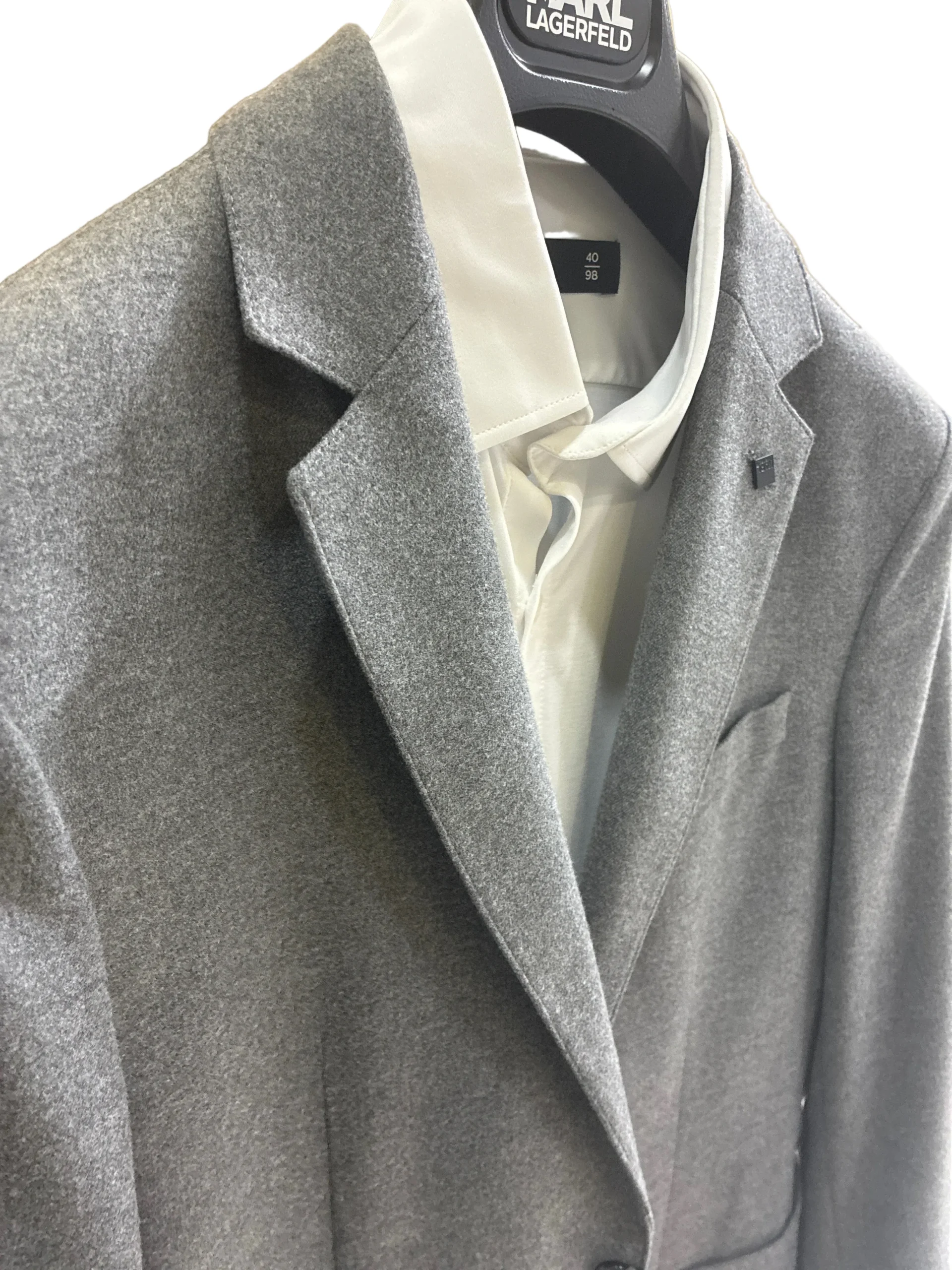 Veste en flanelle grise, deux boutons, suivi de deux poches plaquées à l’avant
